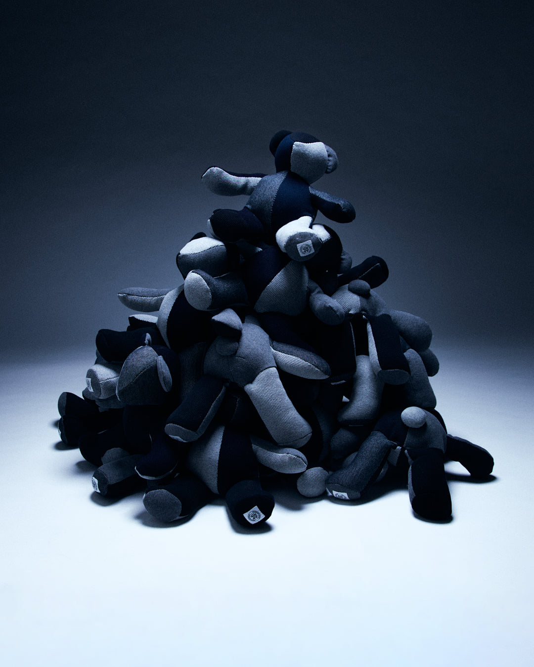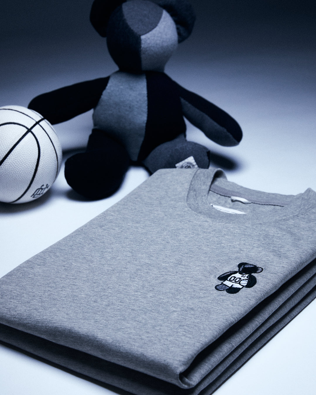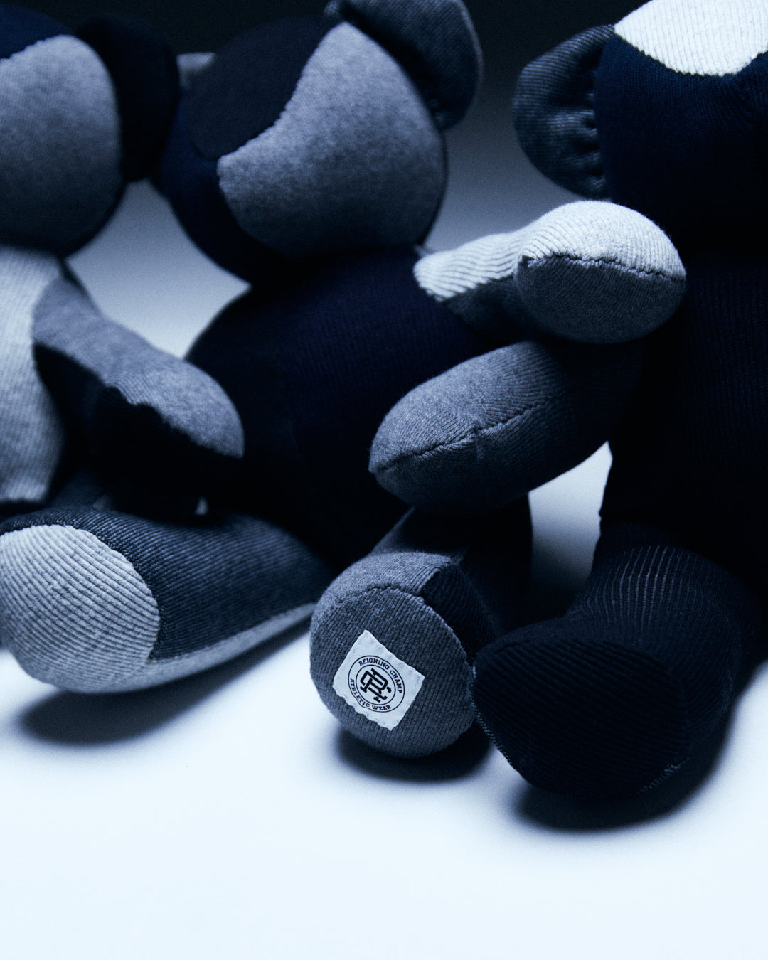 Colour-blocked in a mix of rib, jersey, and terry fabrics in our core Heather Grey, Navy, and Black hues, each upcycled teddy bear is one-of-a-kind and deftly crafted by local artisans in Vancouver, BC. The limited release is accompanied by a commemorative Midweight Jersey T-Shirt featuring an embroidered rendition of the bear in an RC double zero basketball uniform.