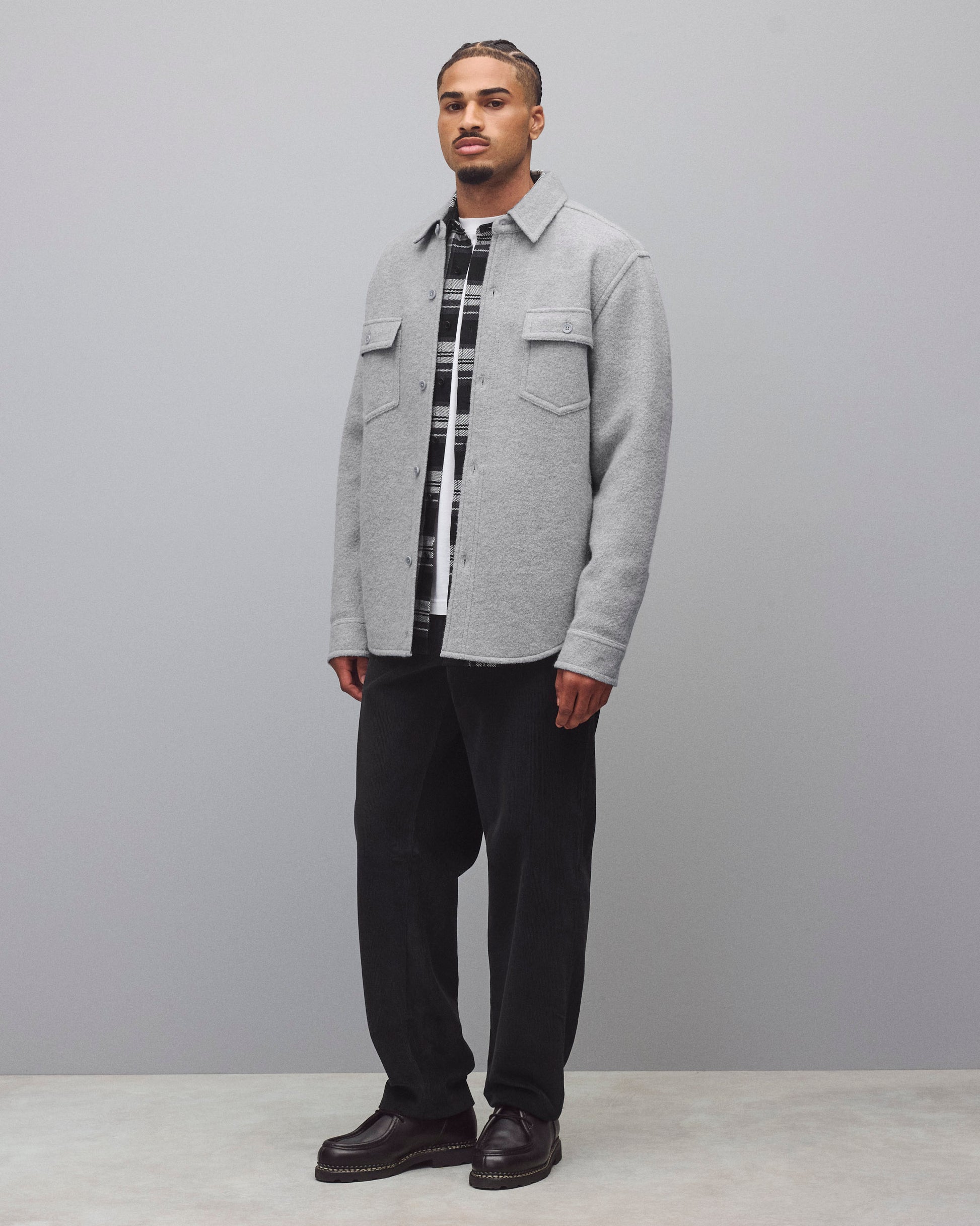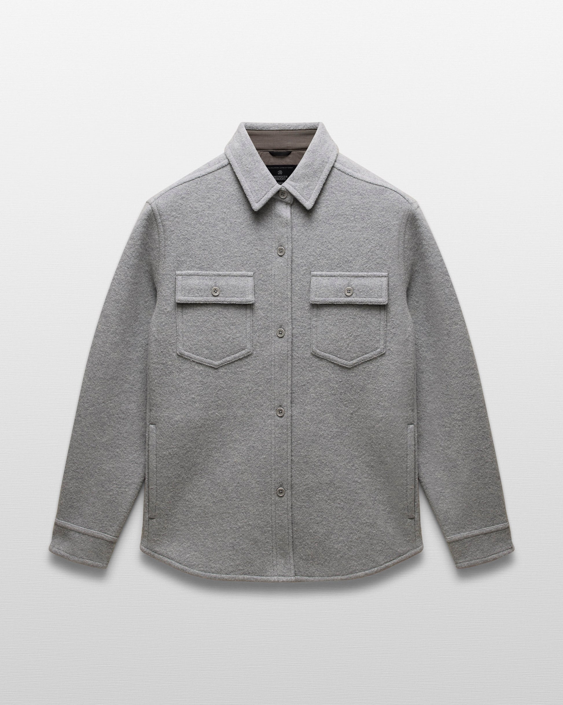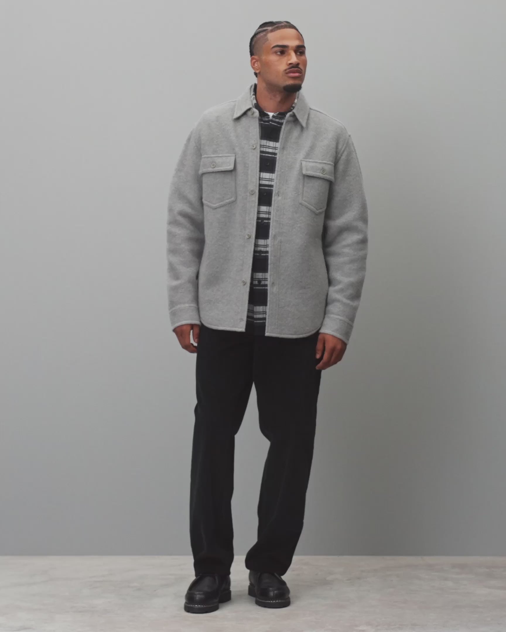 This classic overshirt is crafted from boiled merino wool with a dense, hairy texture. Featuring a standard fit, with full-cut sleeves and torso to provide versatility for layering. Designed with a pointed collar, flap chest pockets, corozo logo buttons, on-seam side pockets, adjustable cuffs, and a scooped hem.