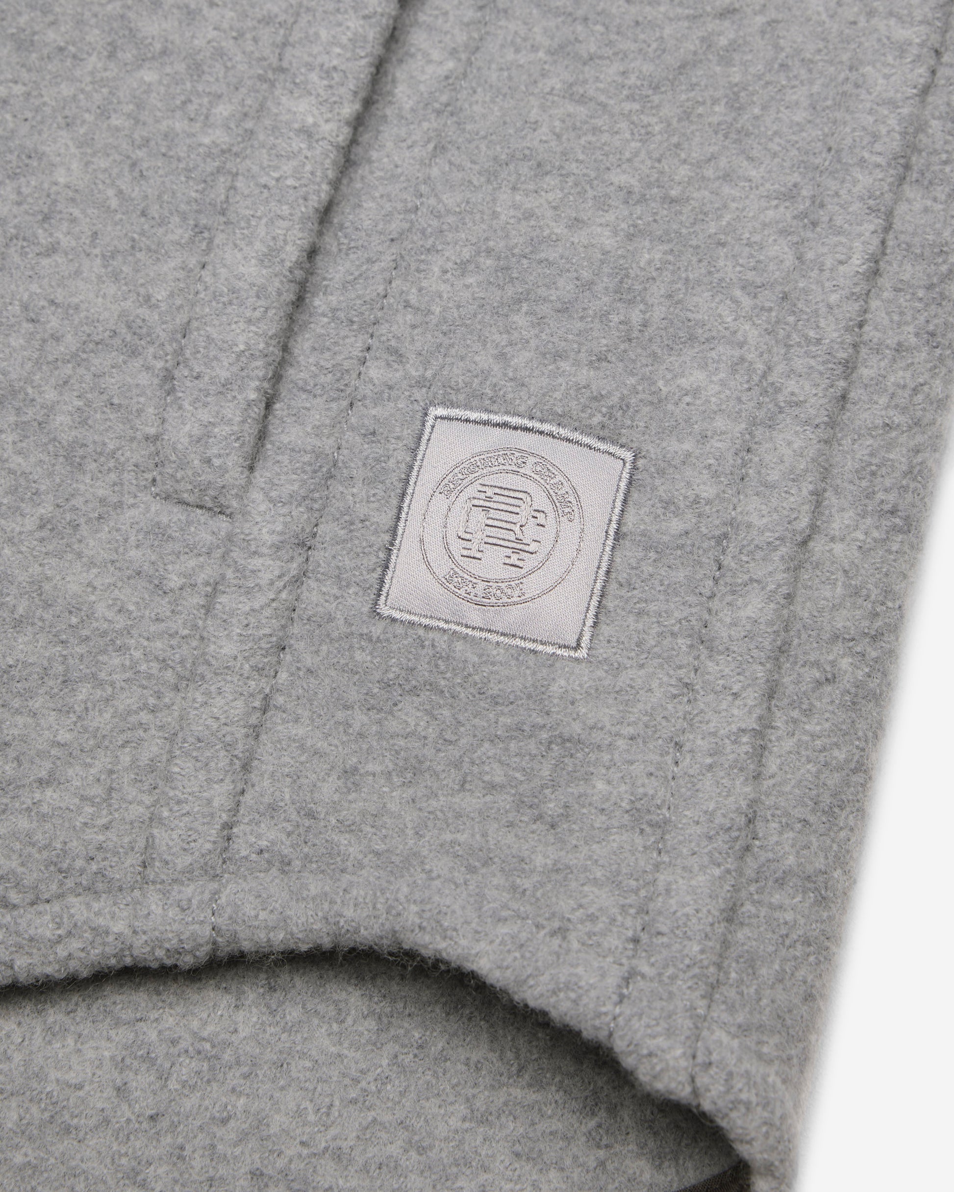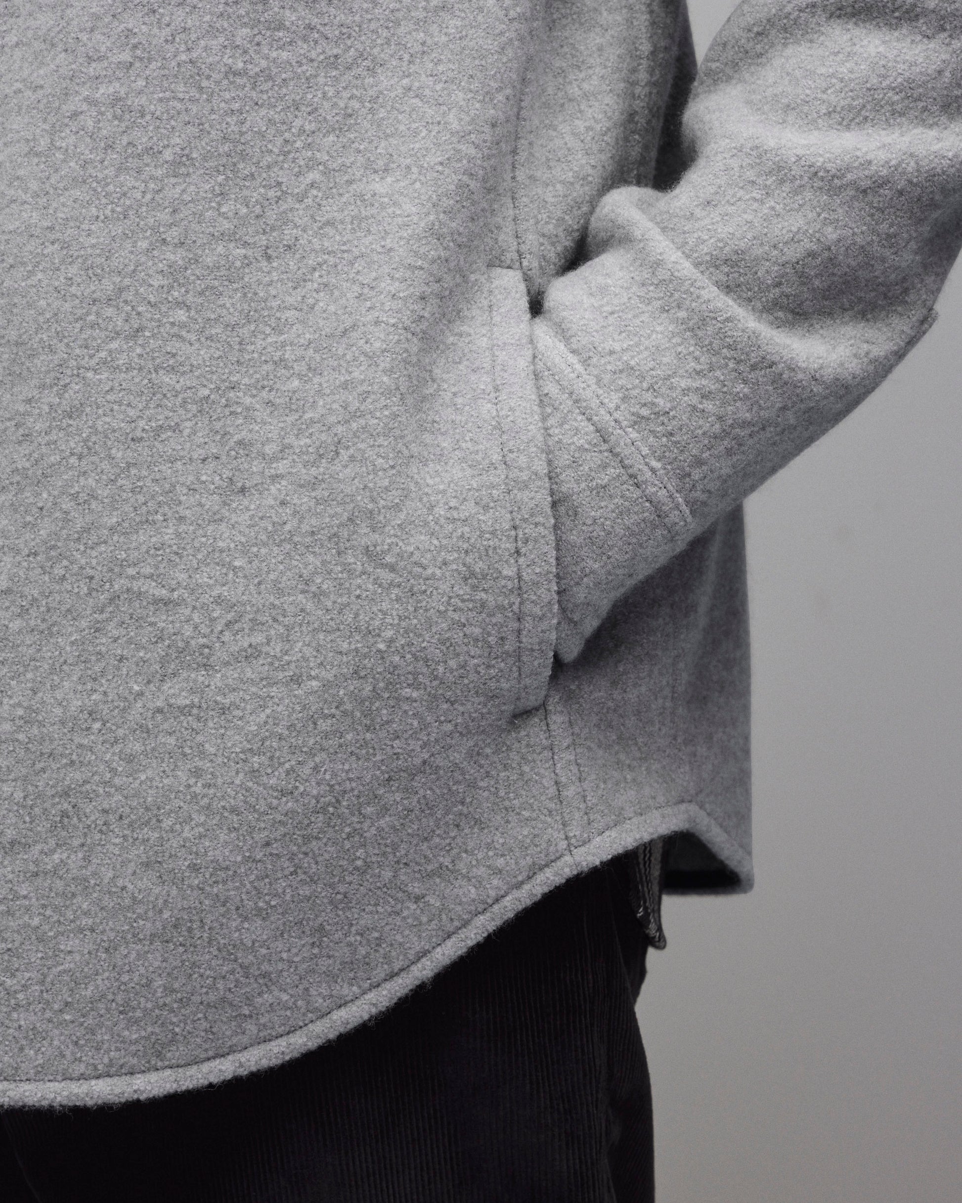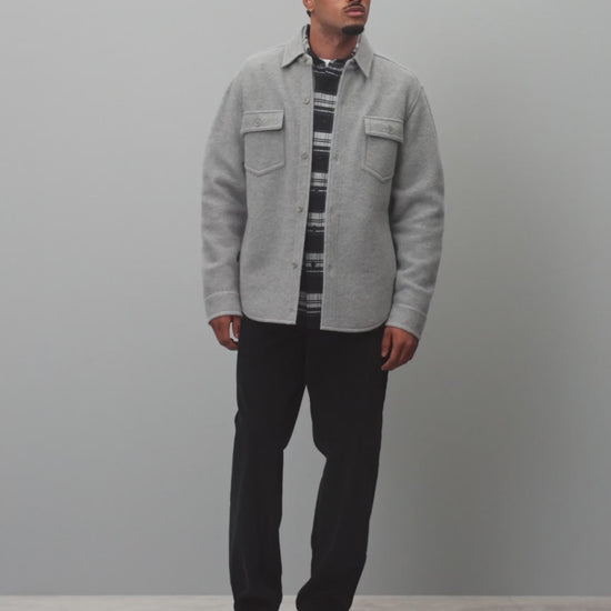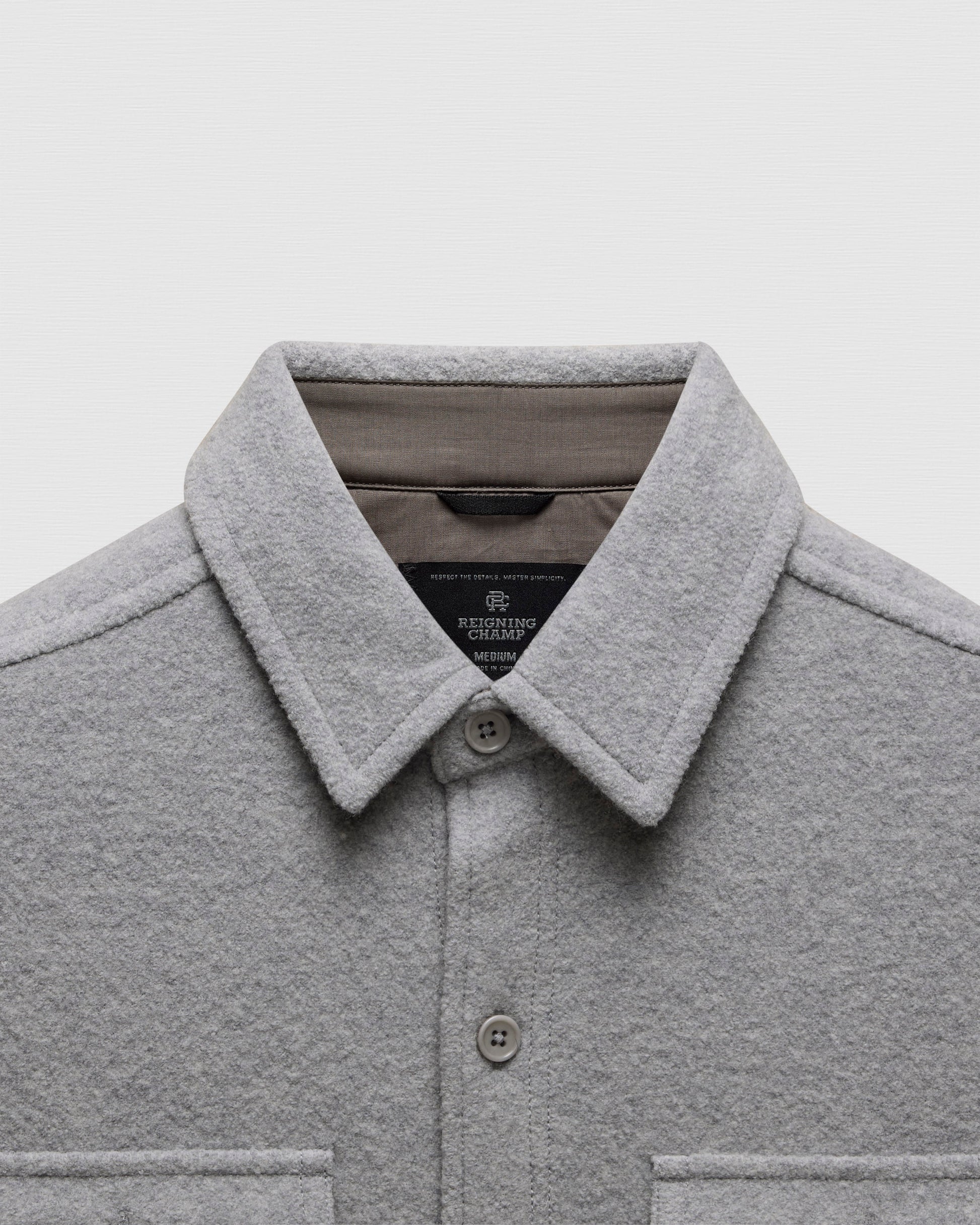 This classic overshirt is crafted from boiled merino wool with a dense, hairy texture. Featuring a standard fit, with full-cut sleeves and torso to provide versatility for layering. Designed with a pointed collar, flap chest pockets, corozo logo buttons, on-seam side pockets, adjustable cuffs, and a scooped hem.