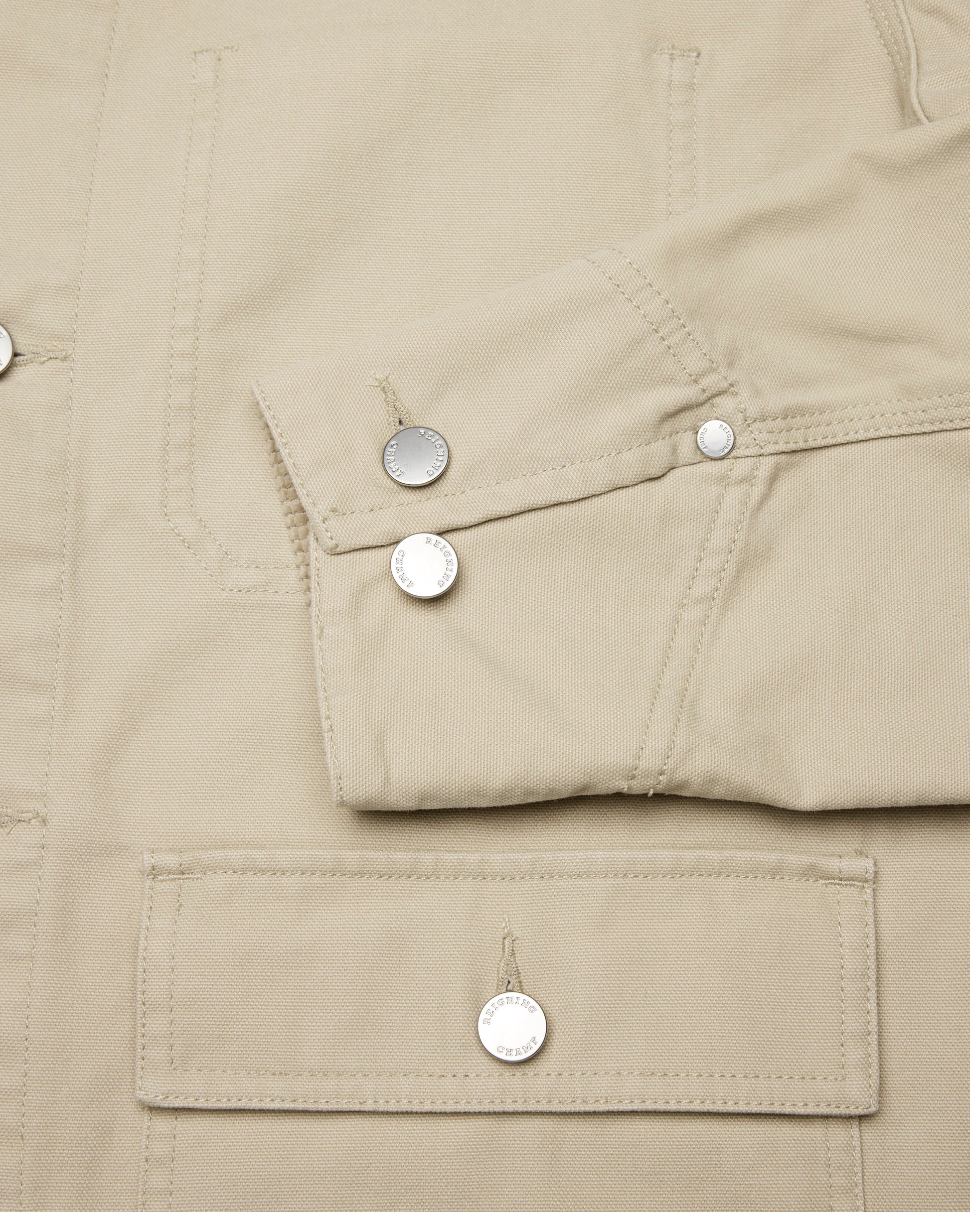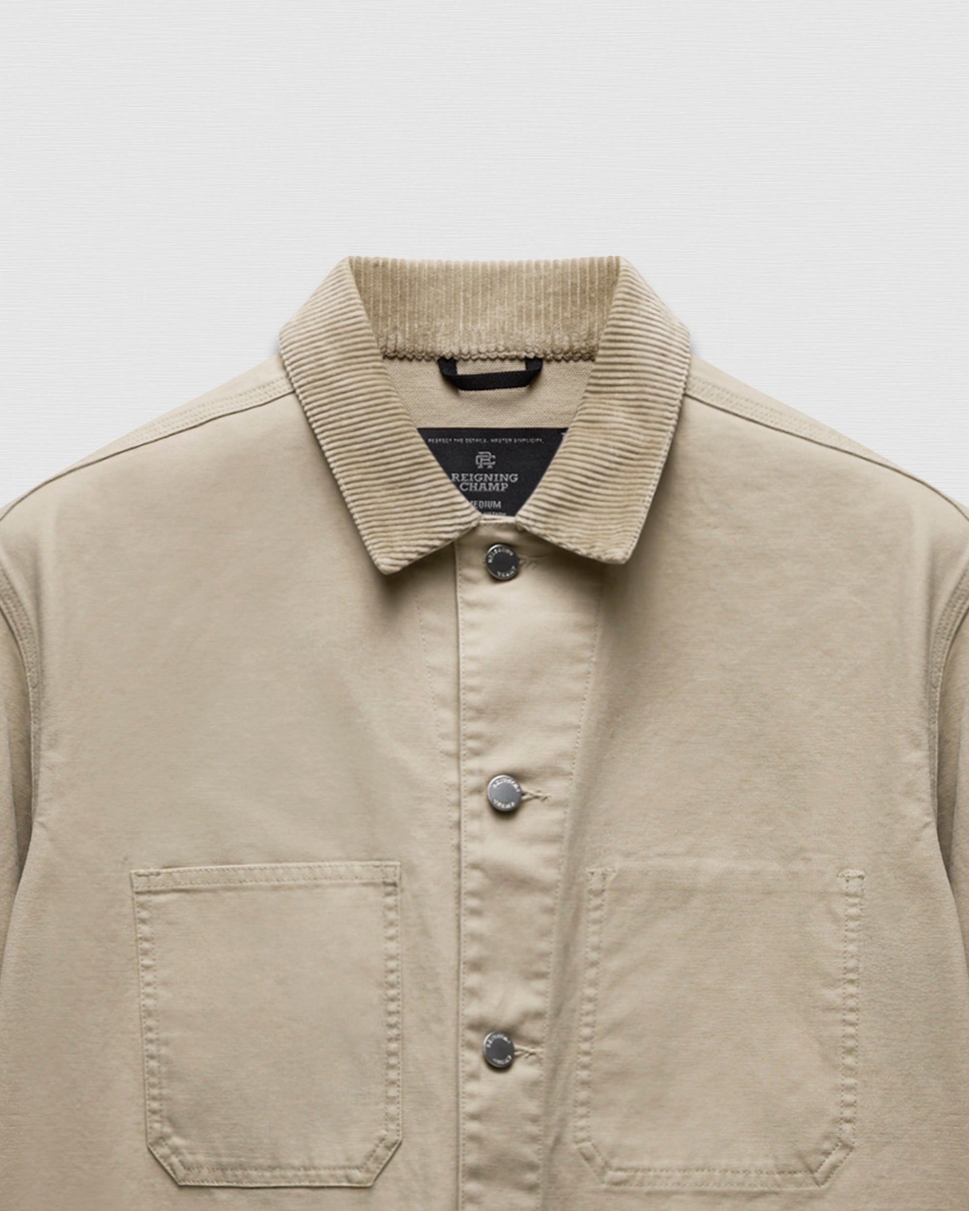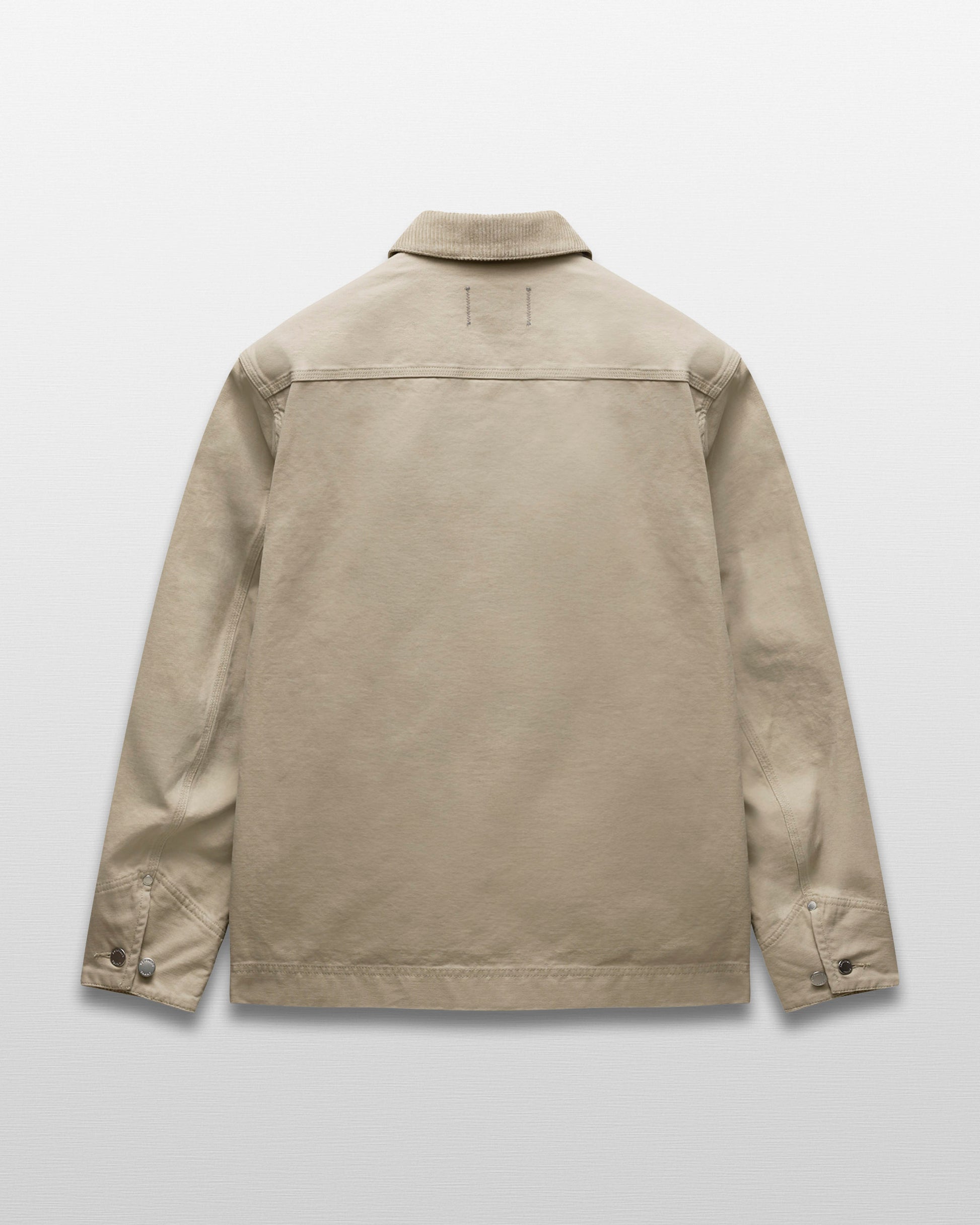 Crafted from midweight cotton canvas, this workwear staple is densely woven and micro-sanded for a soft, lived-in feel. Featuring a standard straight cut with a flat hem that falls below the waist. Designed with a corduroy collar, tack button closure, mitered patch pockets, and two flap pockets. Finished with lined cuffs and rivets for durable reinforcement.