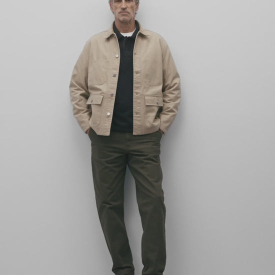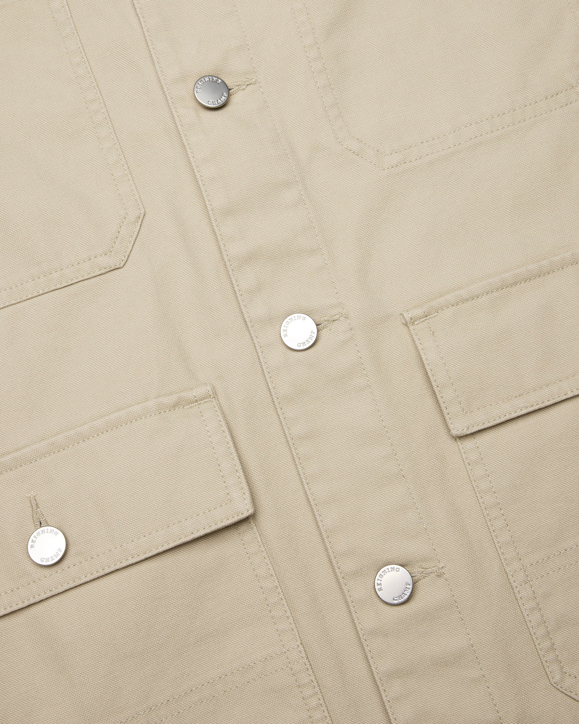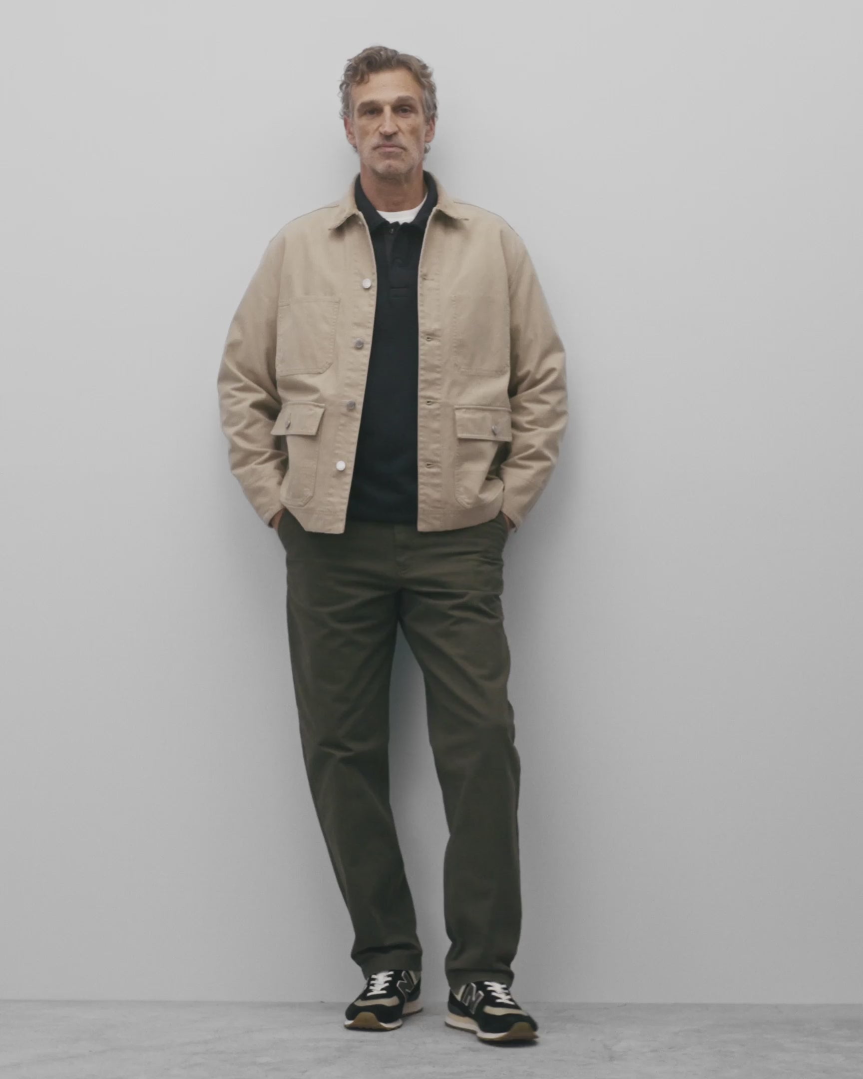 Crafted from midweight cotton canvas, this workwear staple is densely woven and micro-sanded for a soft, lived-in feel. Featuring a standard straight cut with a flat hem that falls below the waist. Designed with a corduroy collar, tack button closure, mitered patch pockets, and two flap pockets. Finished with lined cuffs and rivets for durable reinforcement.