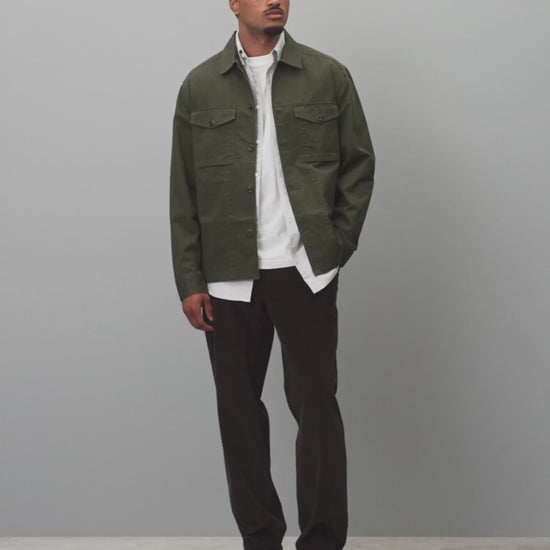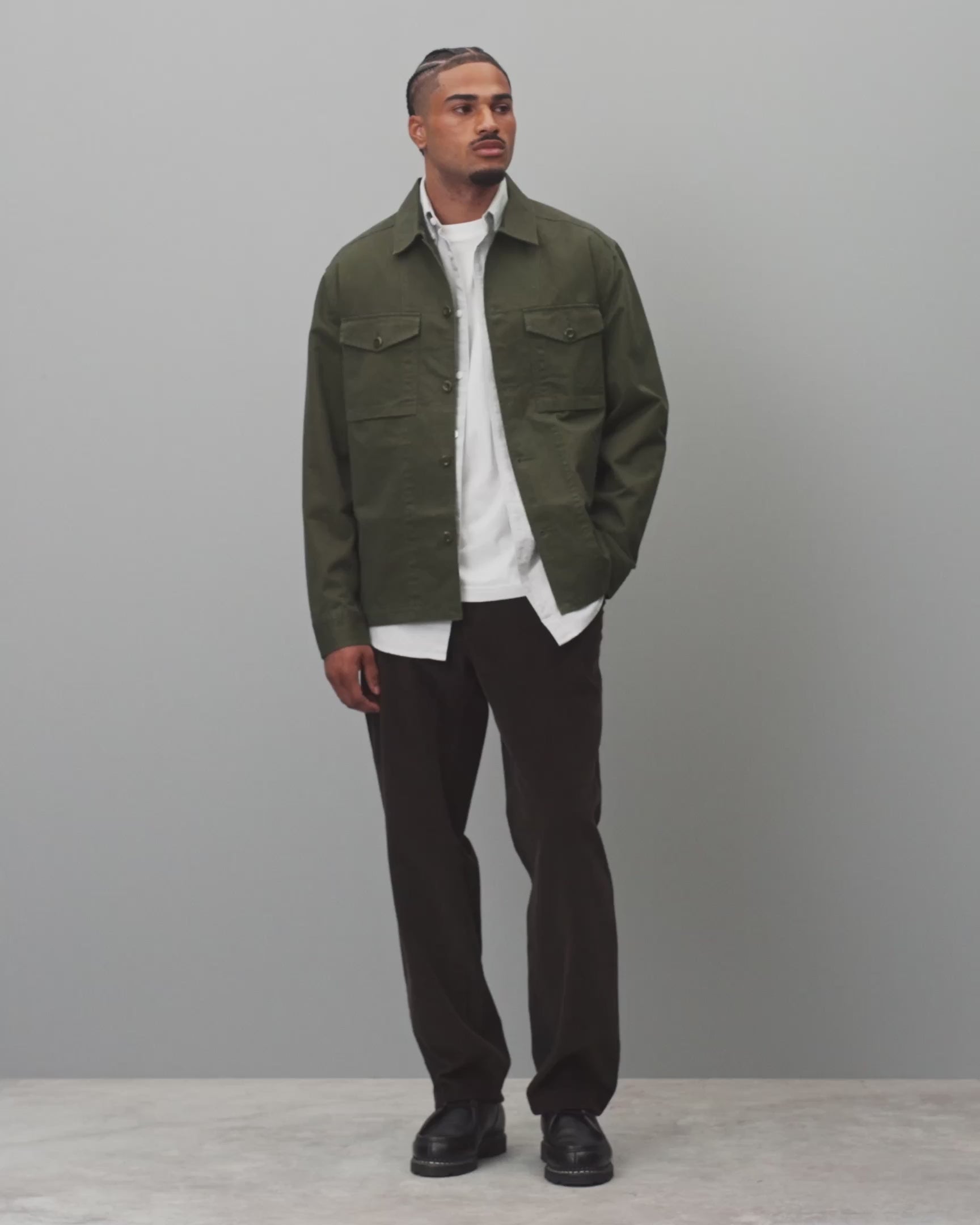 This field shirt is crafted from a midweight cotton chino that's washed for a vintage, lived-in feel. Designed in a boxy standard fit, with a semi-spread collar, large corozo logo buttons, flap chest pockets, on-seam side pockets, and adjustable button cuffs. Finished with flat felled seams and a wide military-style stitch placket.