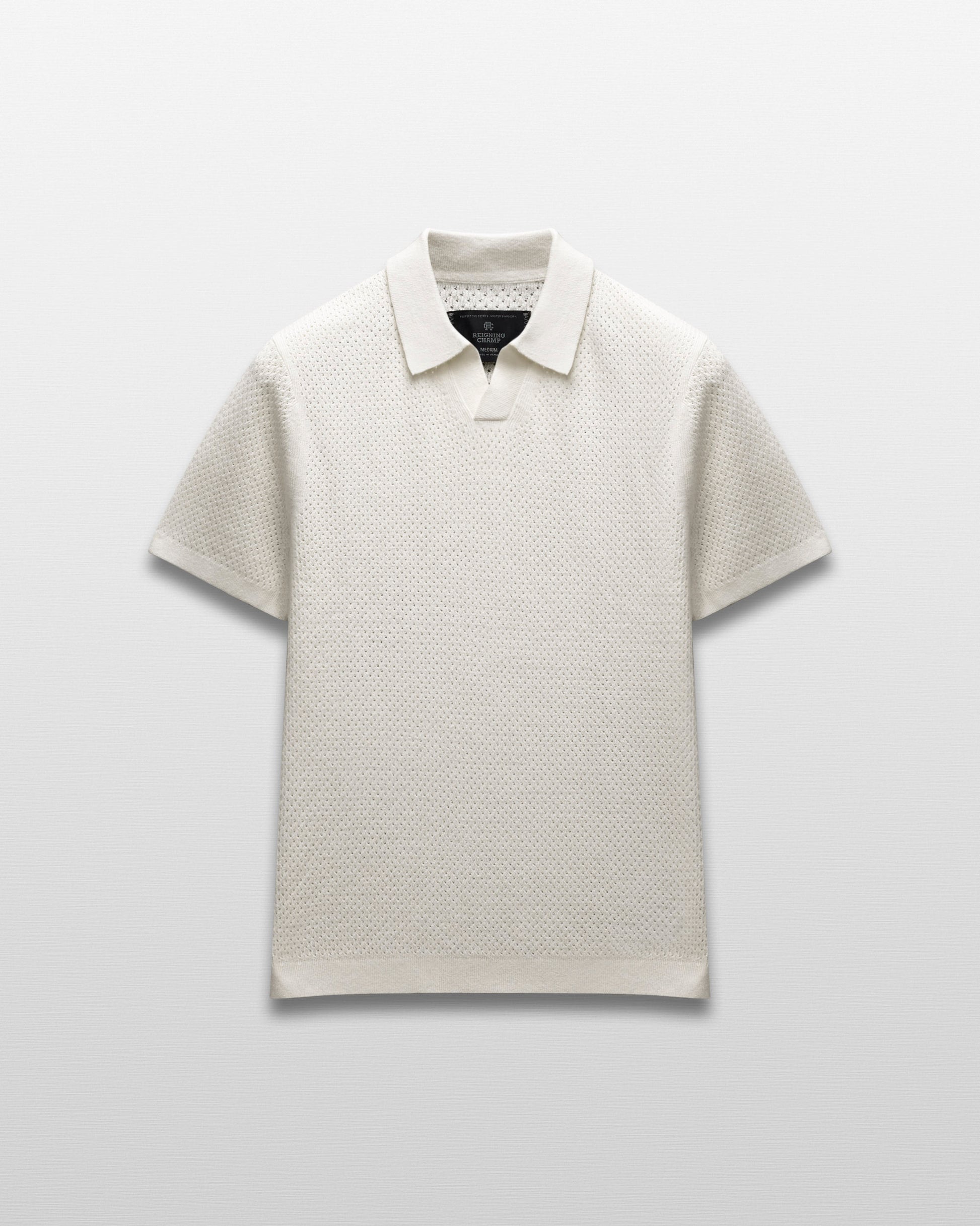 A warm‑weather polo with elevated texture and natural airflow. Crafted from a soft, cotton‑linen blend in an open mesh knit that keeps you cool while maintaining a refined drape. Designed in our Standard fit with full‑cut proportions.