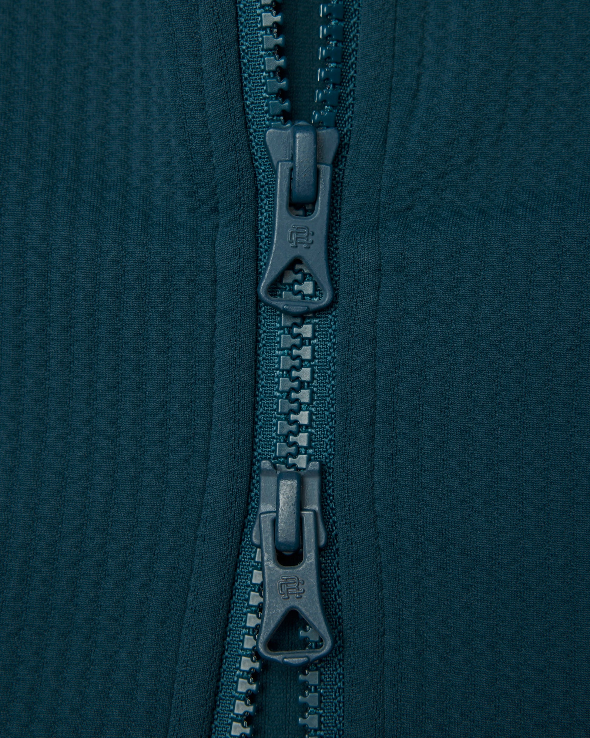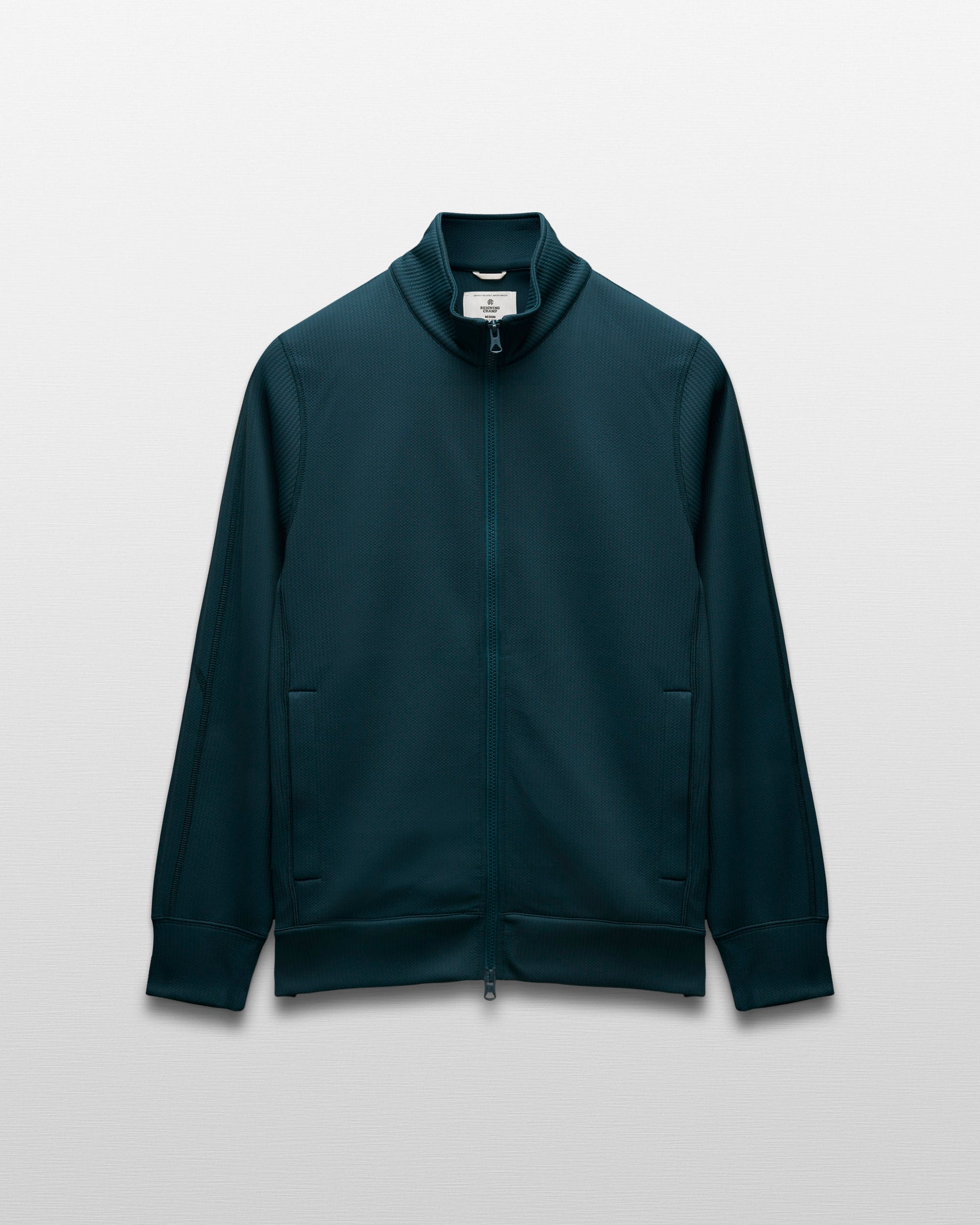 A dual-knit track jacket engineered to provide efficient warmth in cooler conditions. This double knit stretch fabric features a textured face and smooth reverse, for exceptional next-to-skin comfort. Constructed in a trim athletic fit, with a mock neck collar, YKK Vislon two-way zip closure, inseam zip pockets, and self-fabric cuffs and hem.