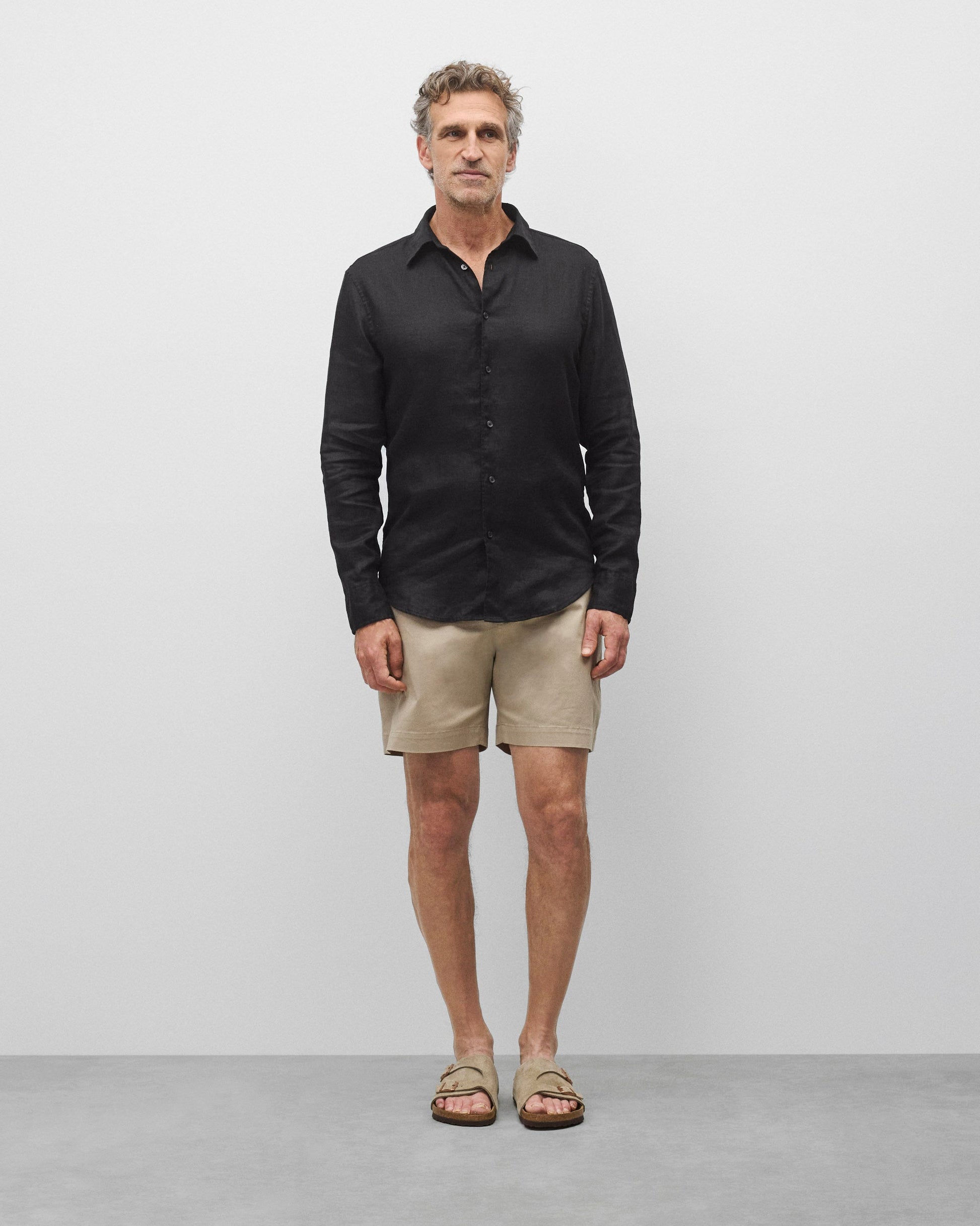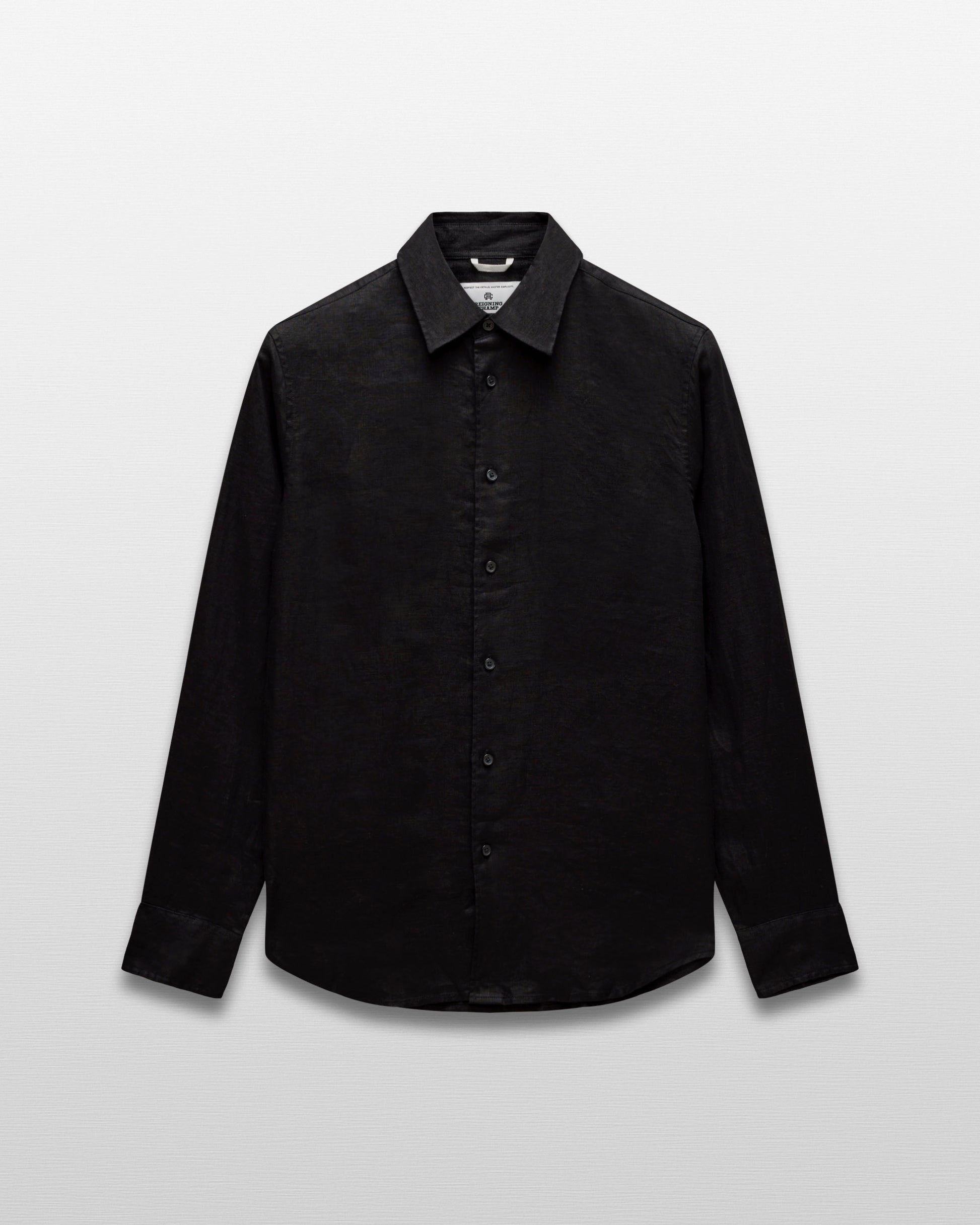 This summer long sleeve button-up shirt is crafted from airy, lightweight linen with a naturally textured hand. Featuring a standard fit, with full cut sleeves and torso. Designed with clean french seams, a pointed collar, faux shell buttons, a curved hem, and side gussets for a tailored drape.
