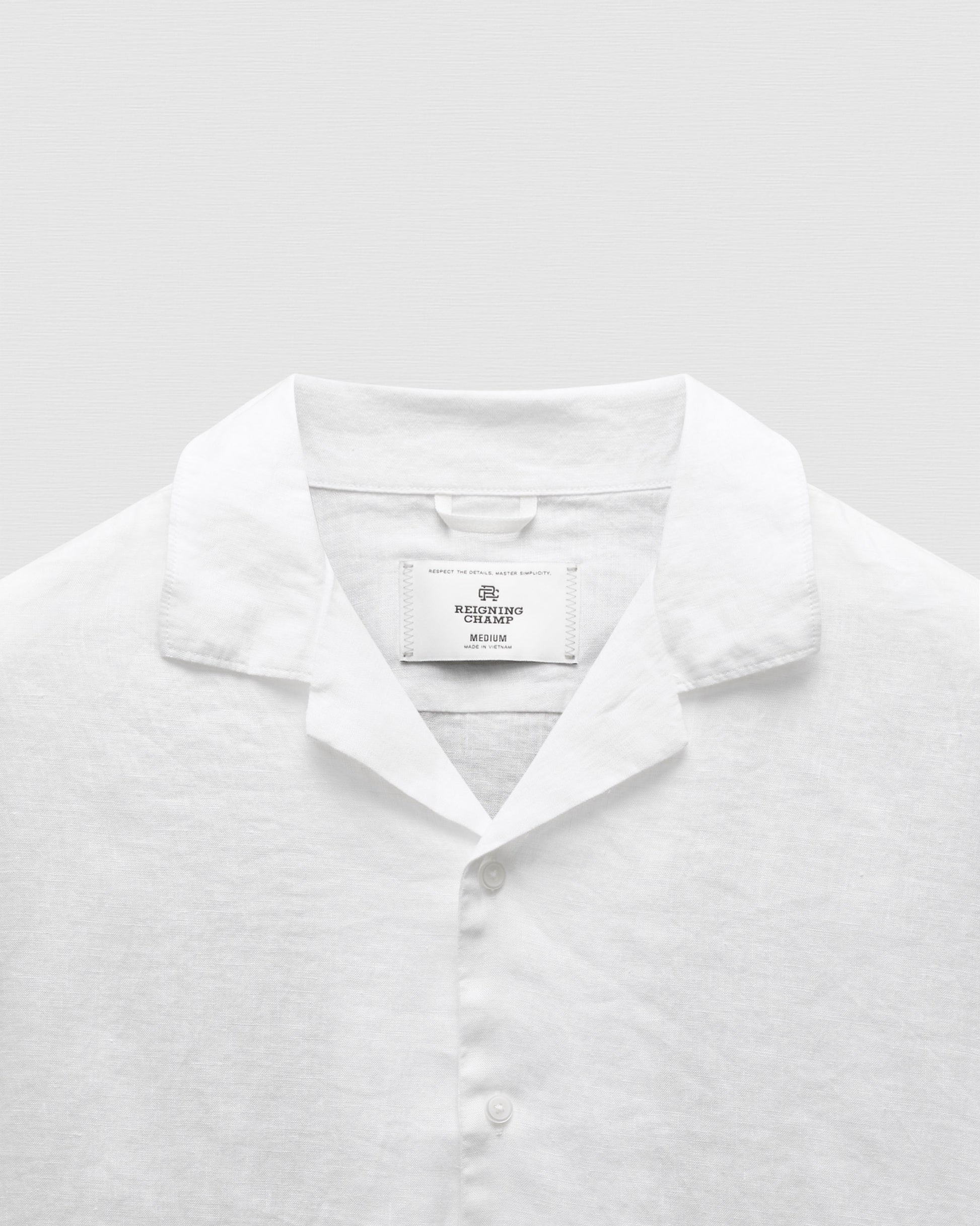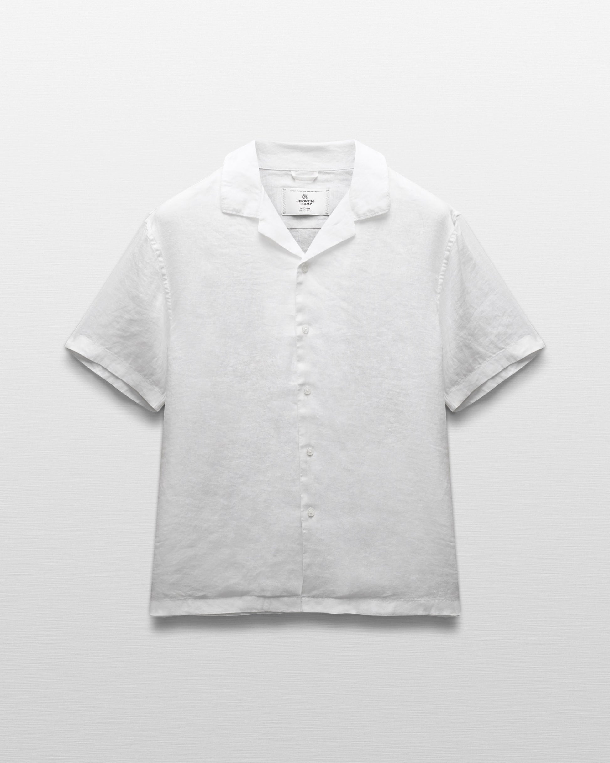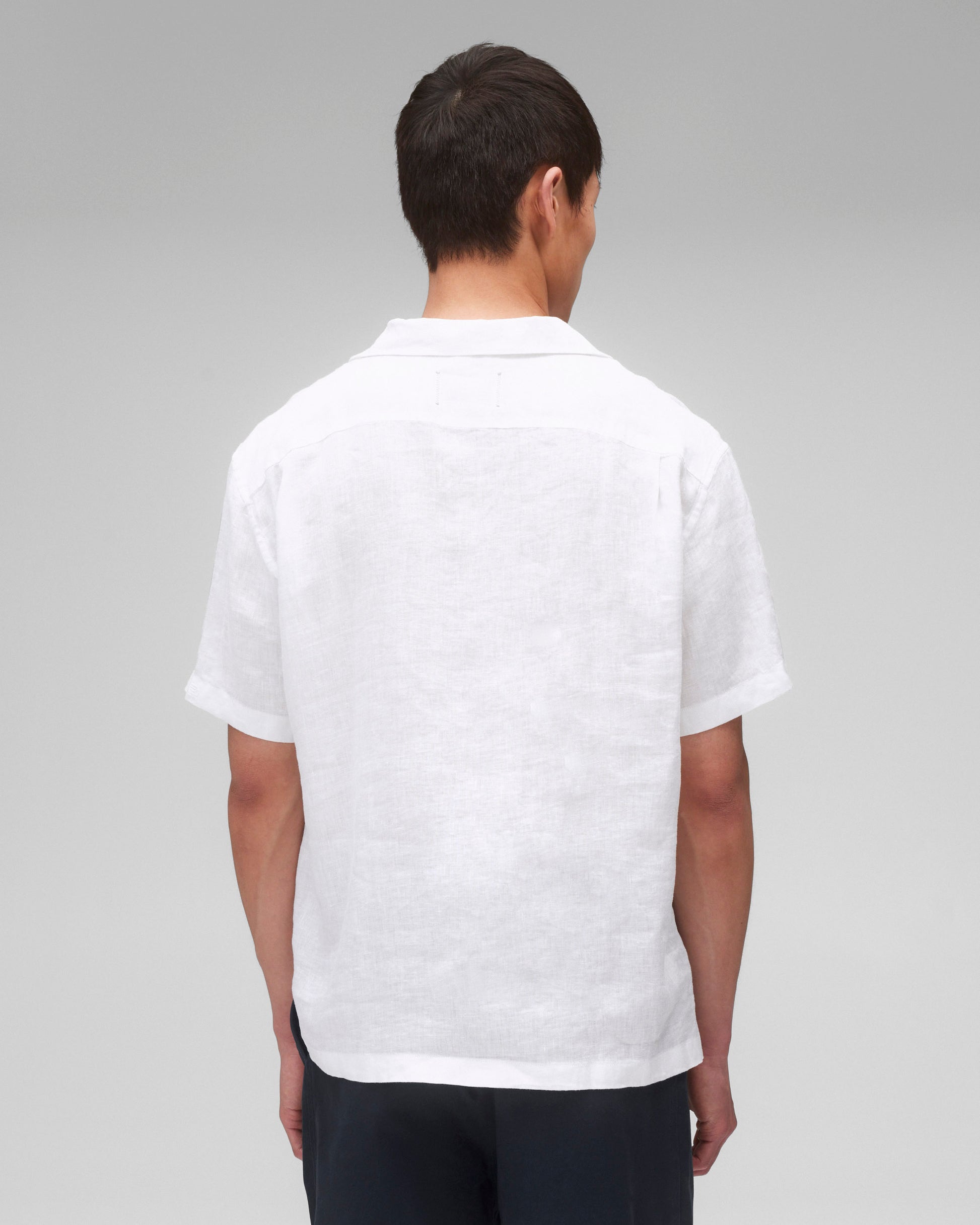 This summer camp collar shirt is crafted from airy, lightweight linen with a naturally textured hand. Featuring a relaxed fit, with generous sleeves and torso. Designed with a clean finished placket, faux shell buttons, side vents, and a flat hem. Finished with tonal monogram embroidery on the left sleeve cuff.