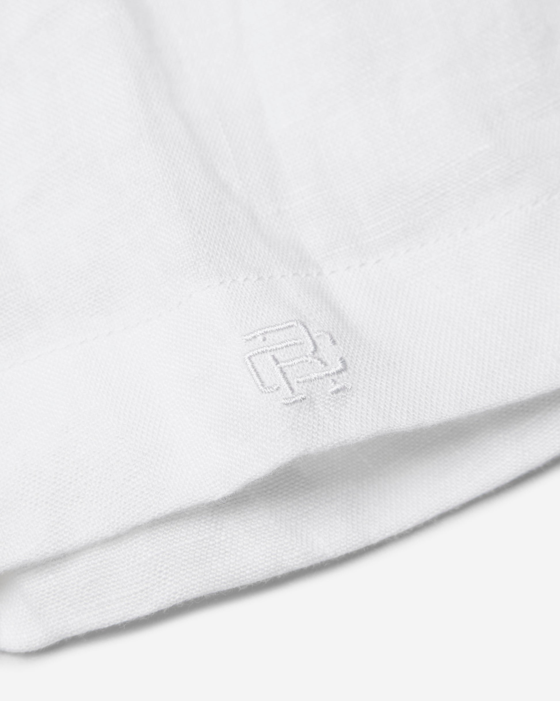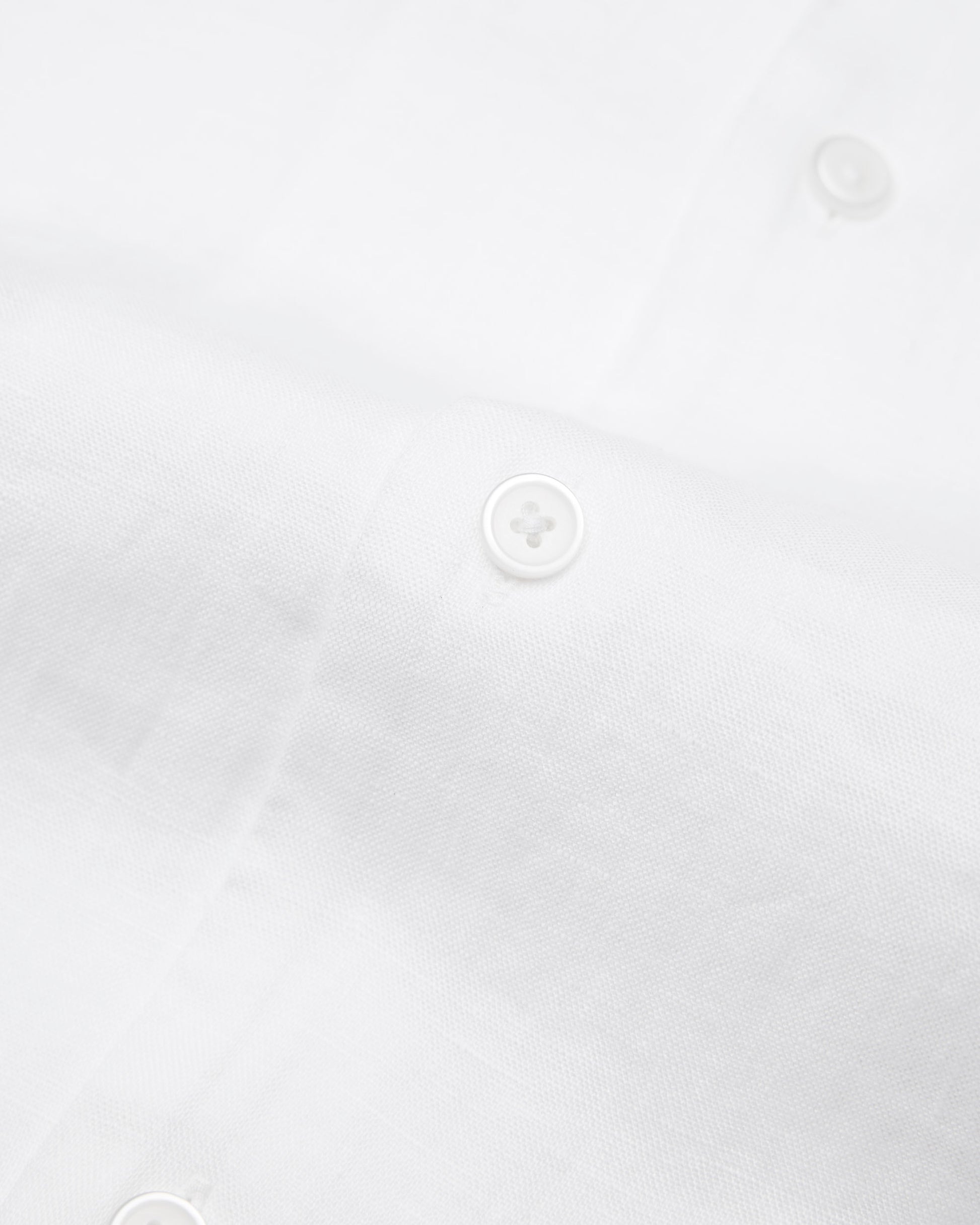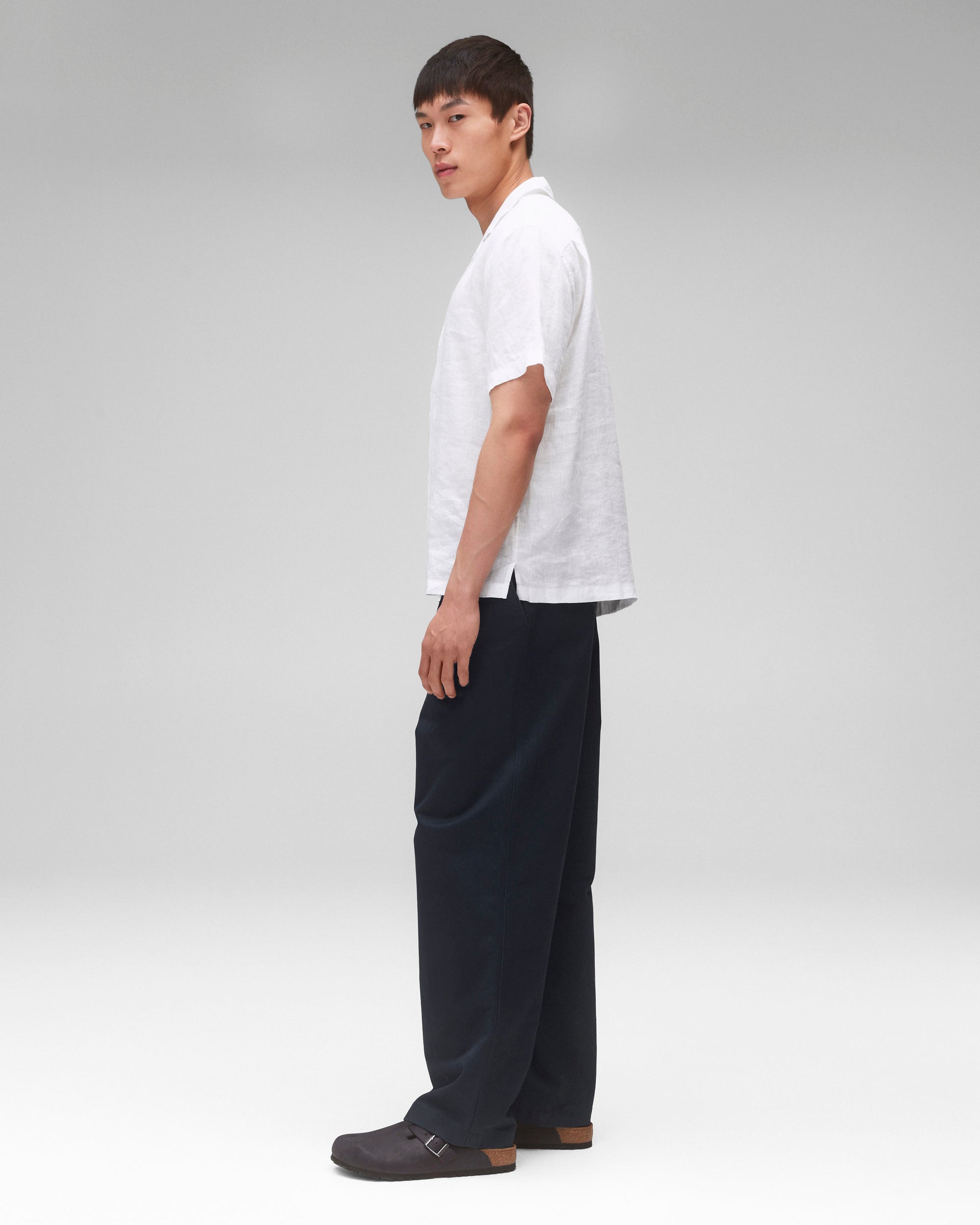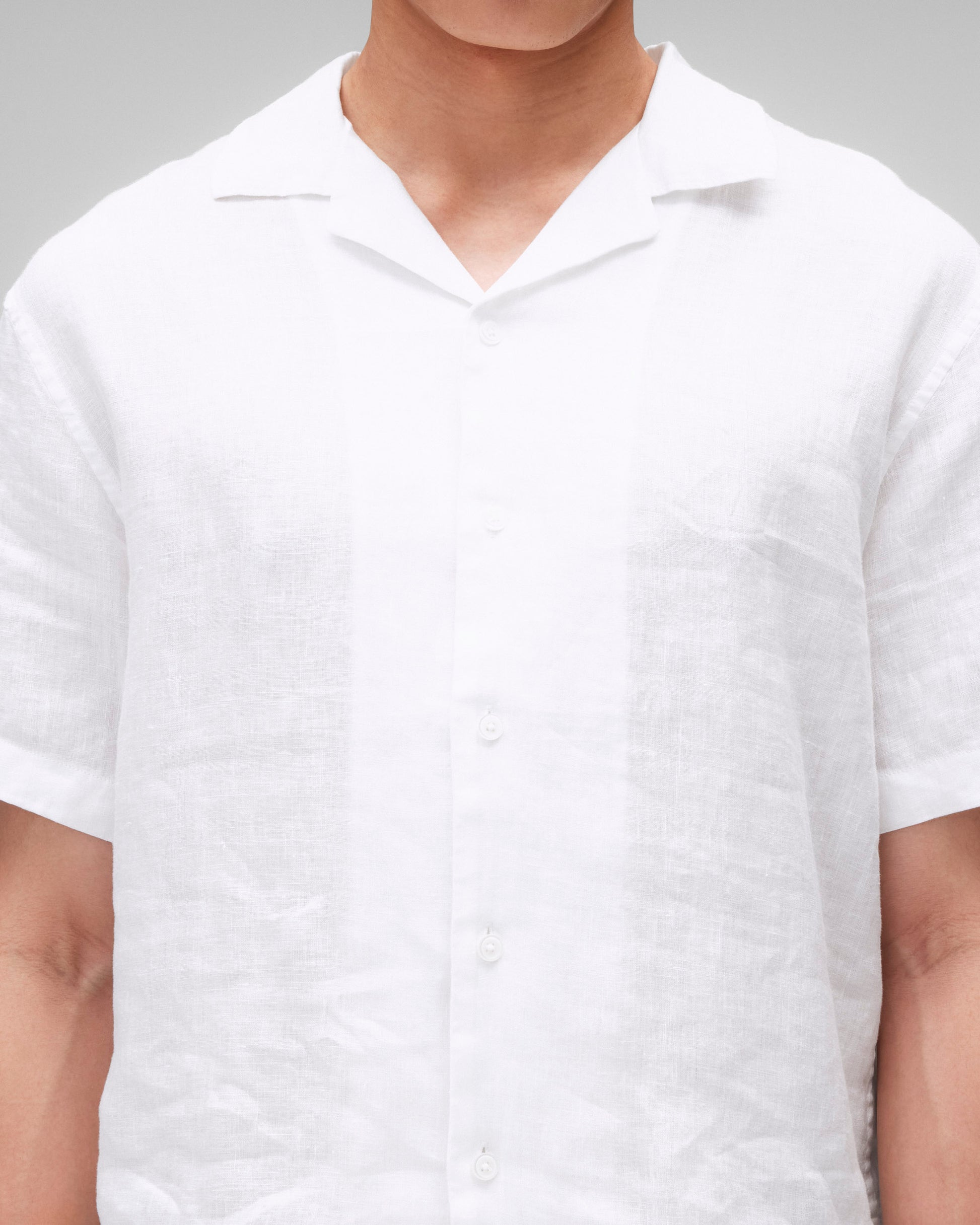 This summer camp collar shirt is crafted from airy, lightweight linen with a naturally textured hand. Featuring a relaxed fit, with generous sleeves and torso. Designed with a clean finished placket, faux shell buttons, side vents, and a flat hem. Finished with tonal monogram embroidery on the left sleeve cuff.