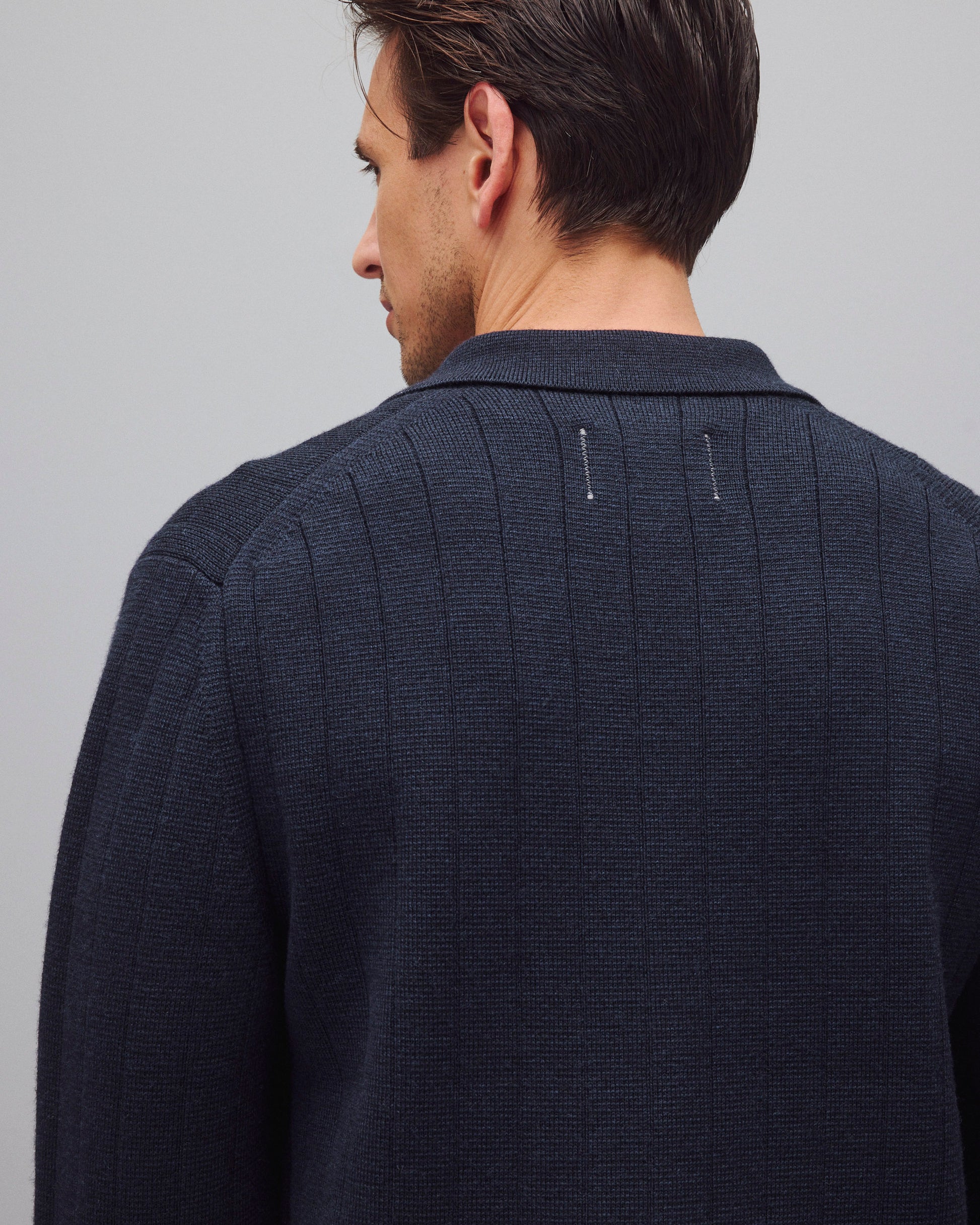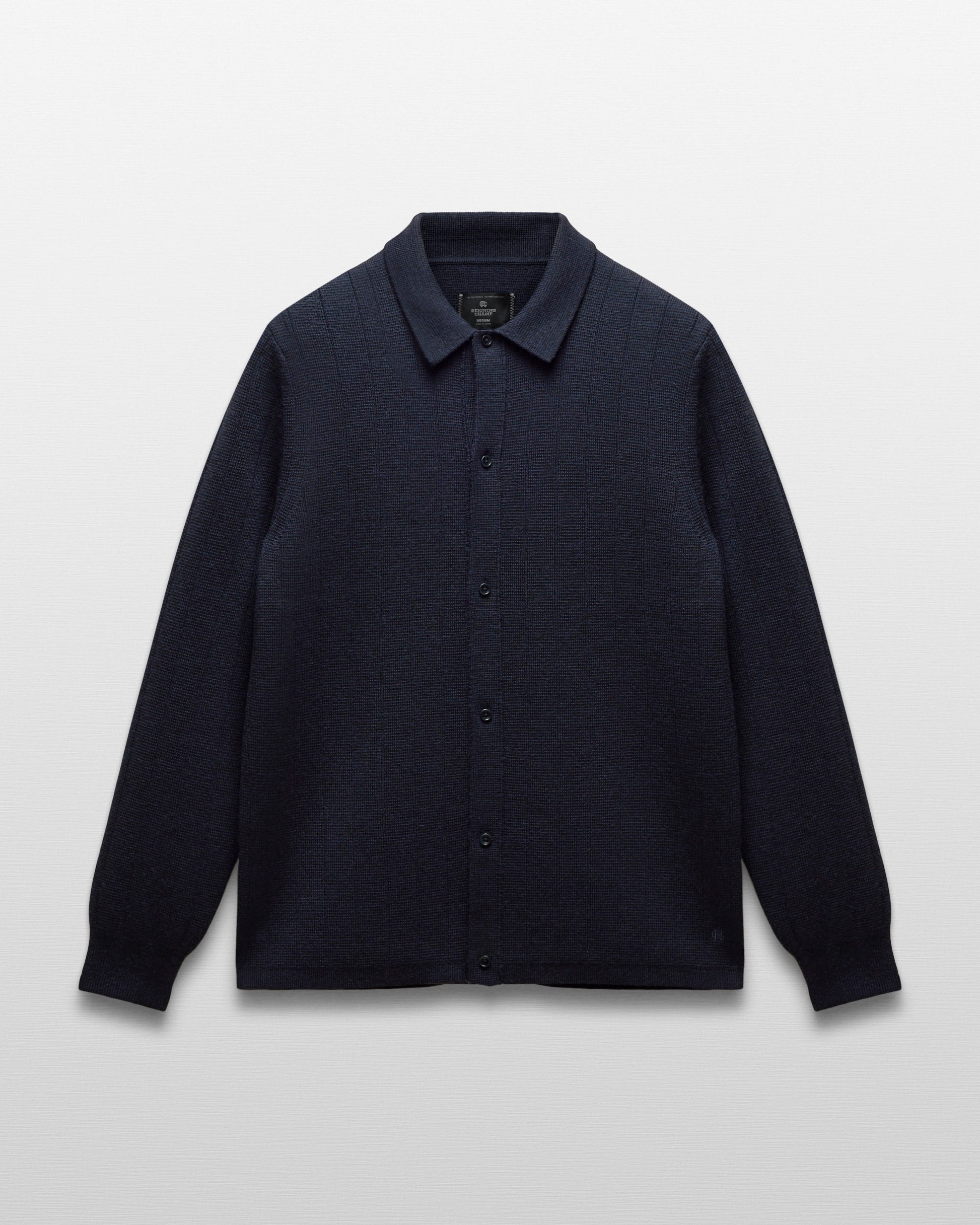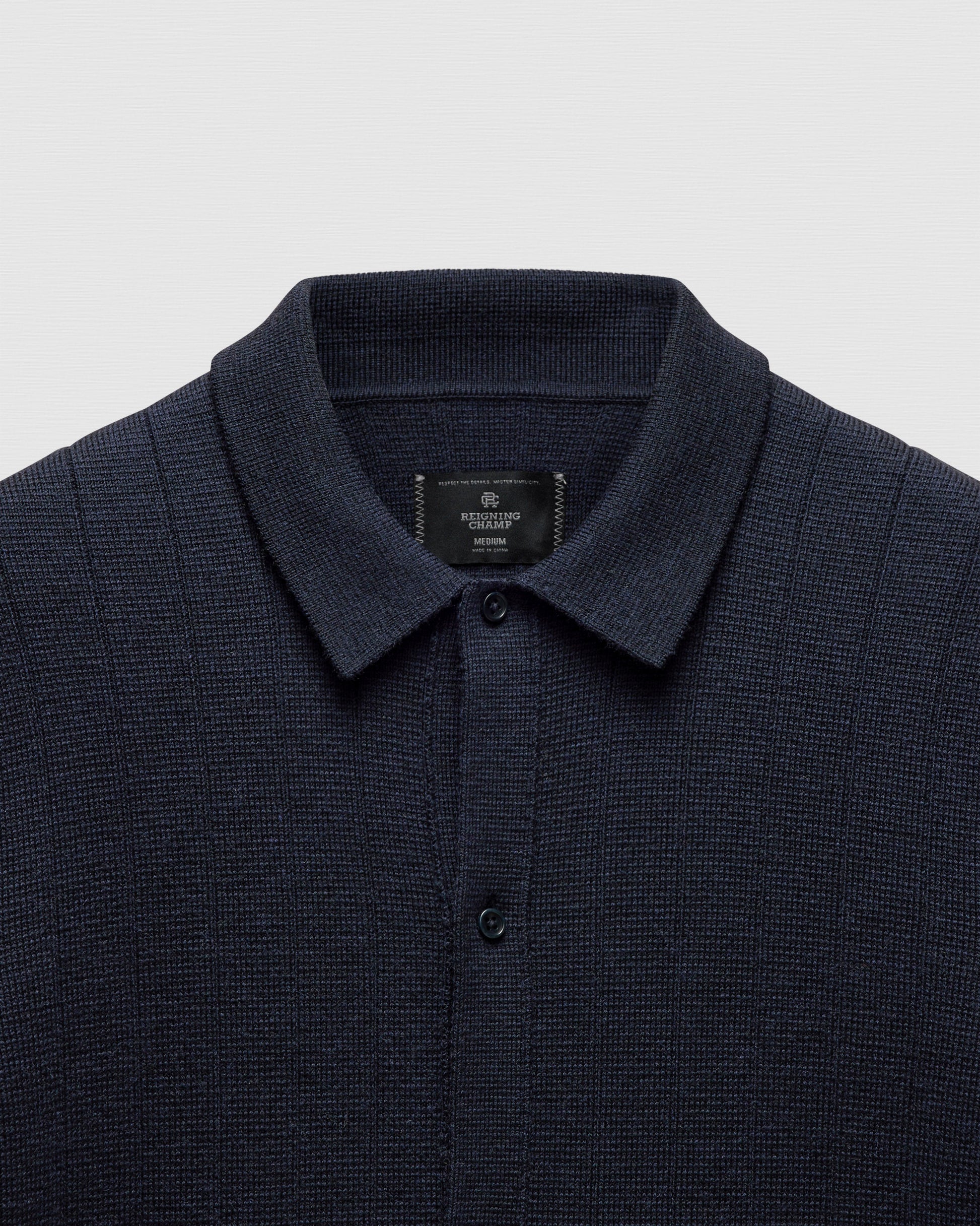 This collared knit shirt is crafted from extrafine merino wool with drop needle detailing. Cut in a standard fit, with fully fashioned seams and french shoulder details. Designed with a milano stitch collar and placket, corozo logo buttons, and premium knit rib.