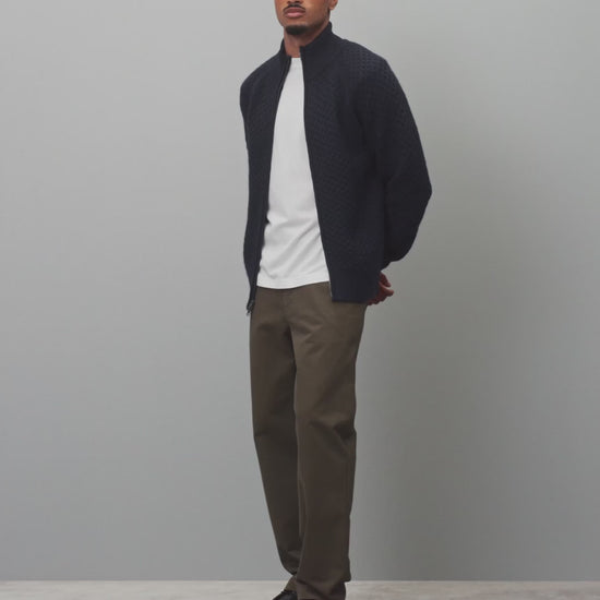 This mock neck zip up is crafted from honeycomb-stitched merino wool, milled in Italy. Featuring a standard fit, with fully fashioned seam construction. Designed with raglan sleeves, a two-way YKK metal zipper, and rib knit side panels, cuffs, and hem.
