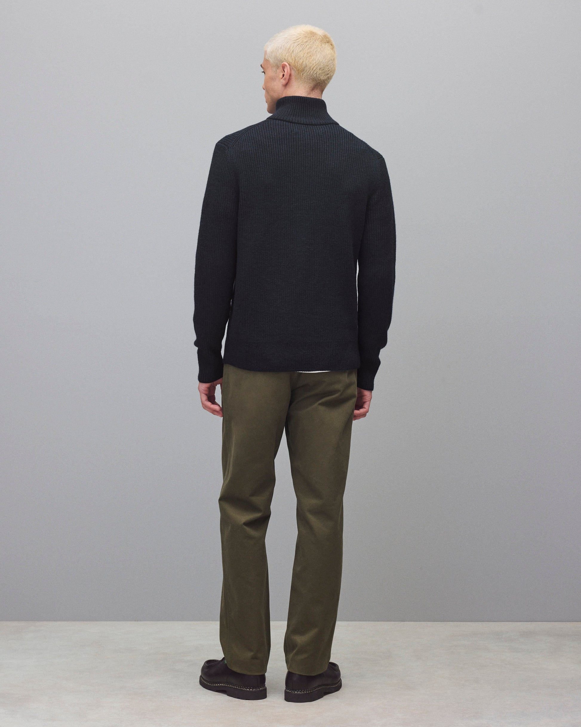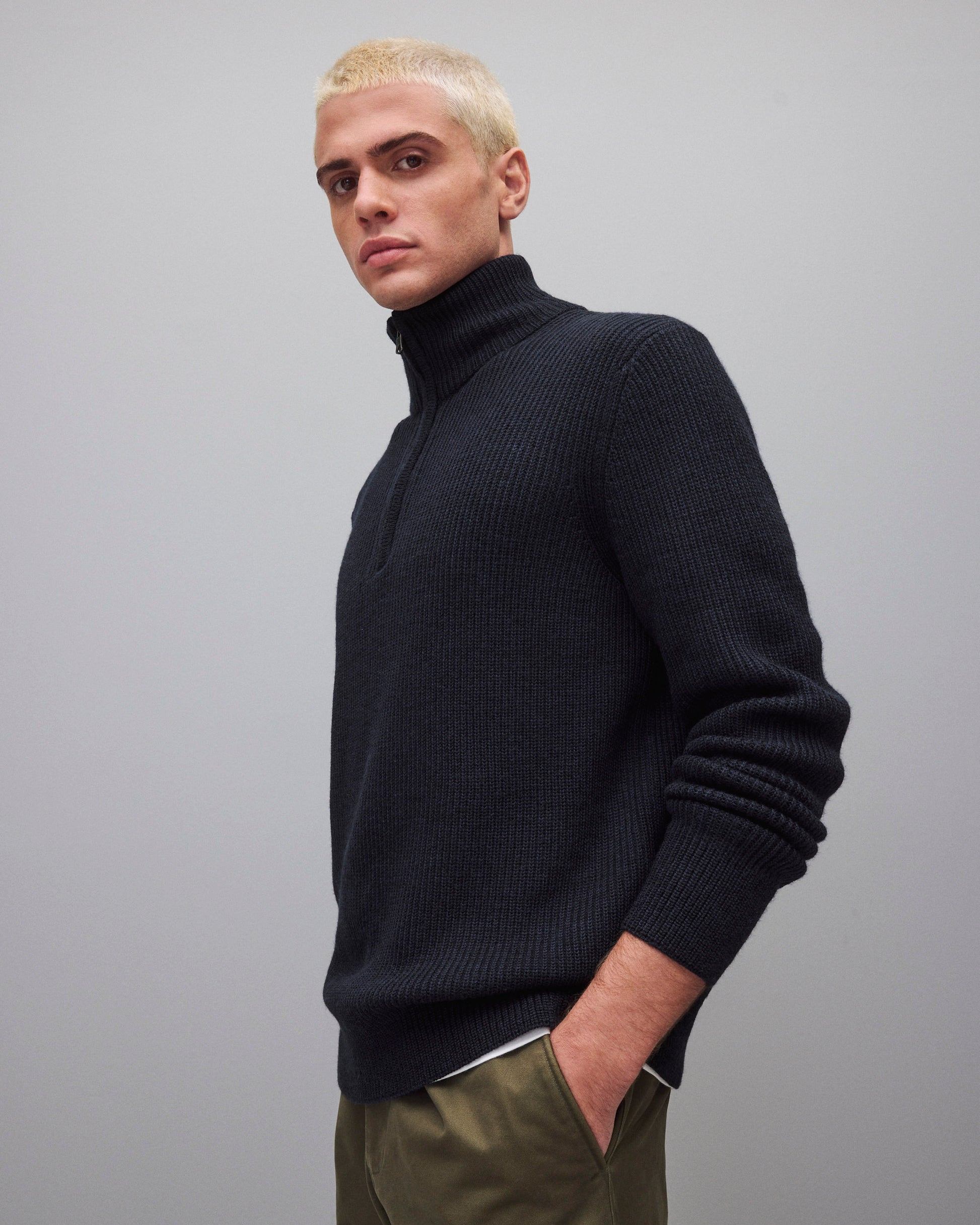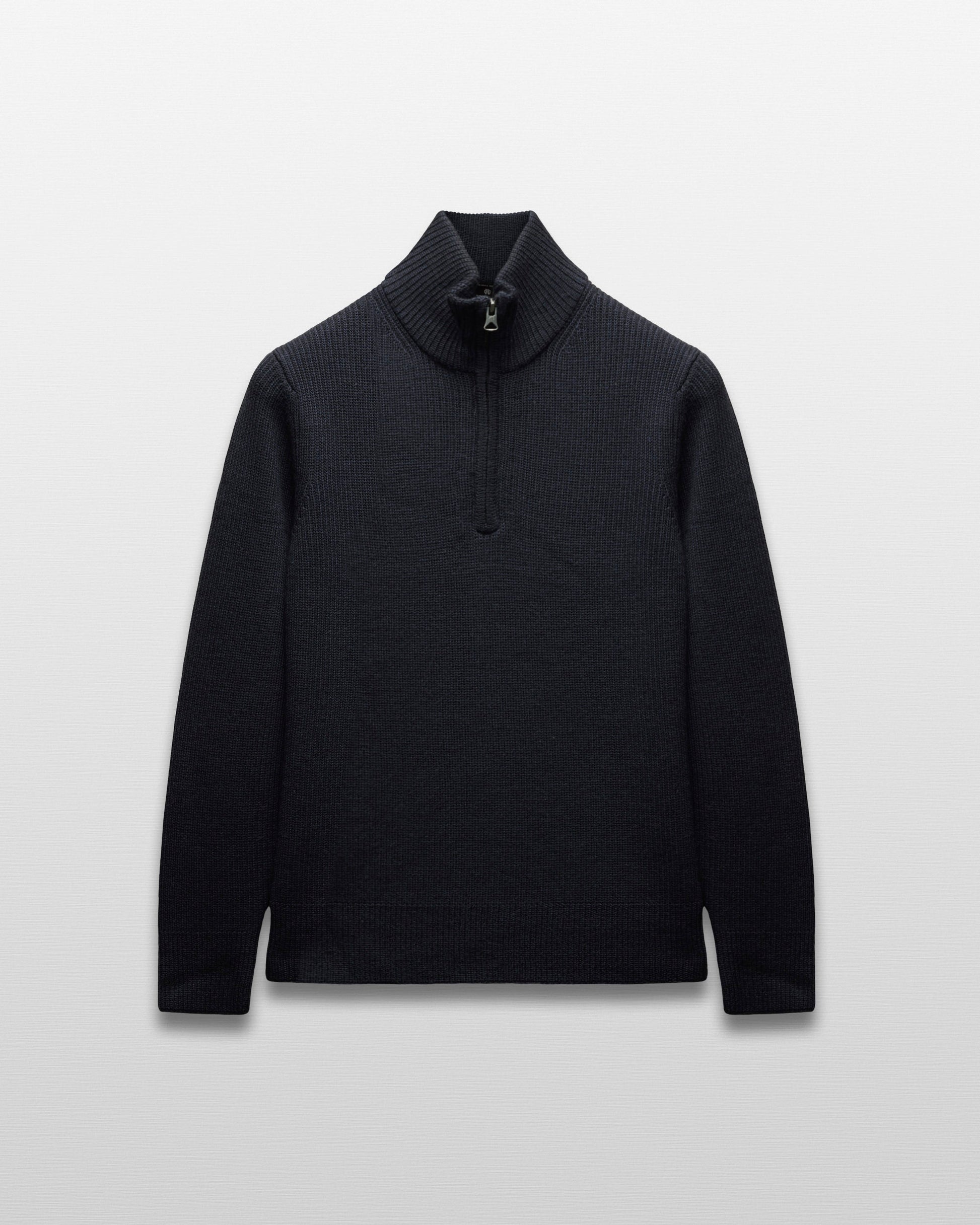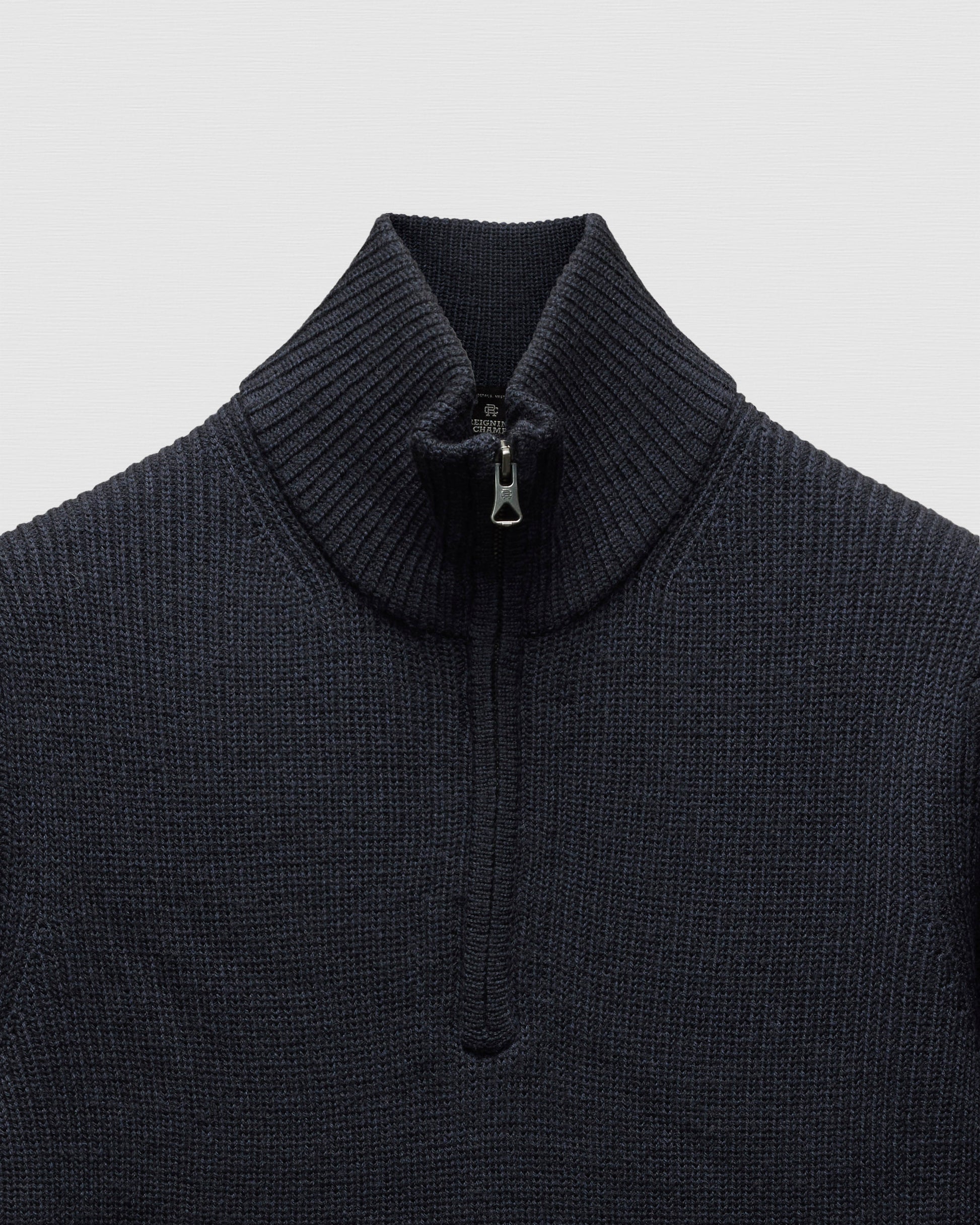 This mock neck quarter zip is crafted from extrafine Italian merino wool, prized for its natural softness, breathability, and temperature regulating properties. Featuring a standard fit, with fully fashioned seams. Designed with a convertible collar, a YKK metal zipper, and lycra-blended trim to enhance shape retention and durability.