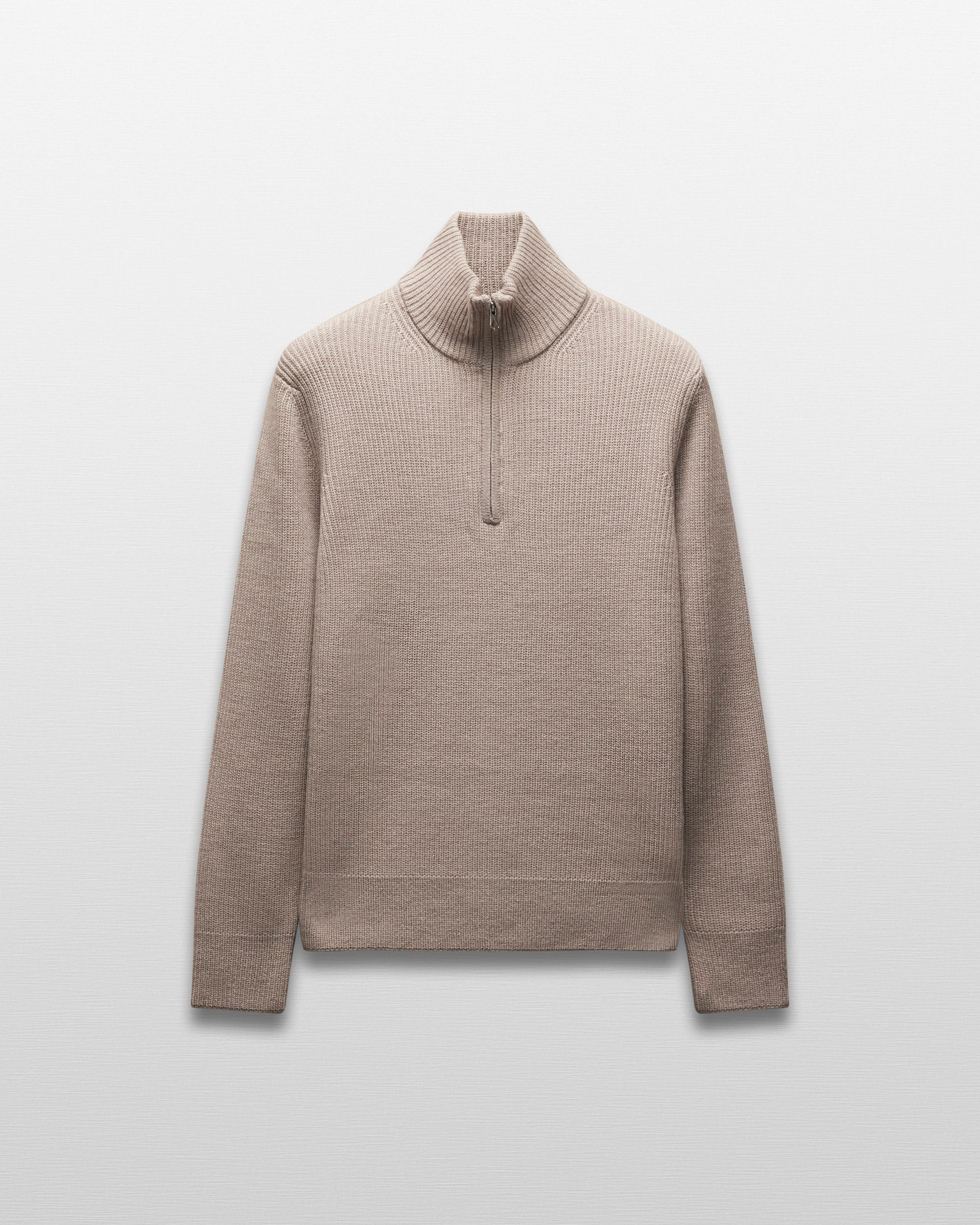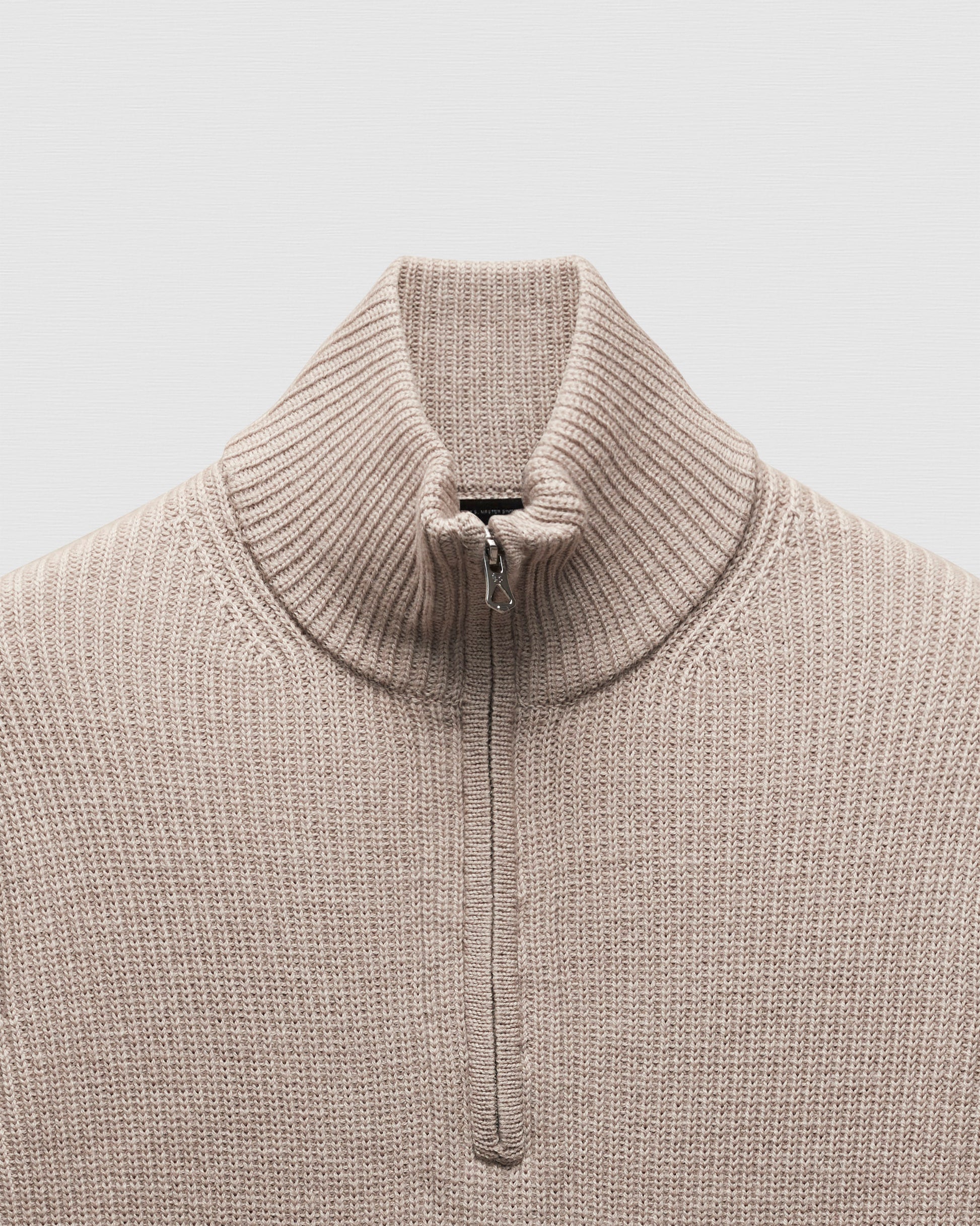 This mock neck quarter zip is crafted from extrafine Italian merino wool, prized for its natural softness, breathability, and temperature regulating properties. Featuring a standard fit, with fully fashioned seams. Designed with a convertible collar, a YKK metal zipper, and lycra-blended trim to enhance shape retention and durability.