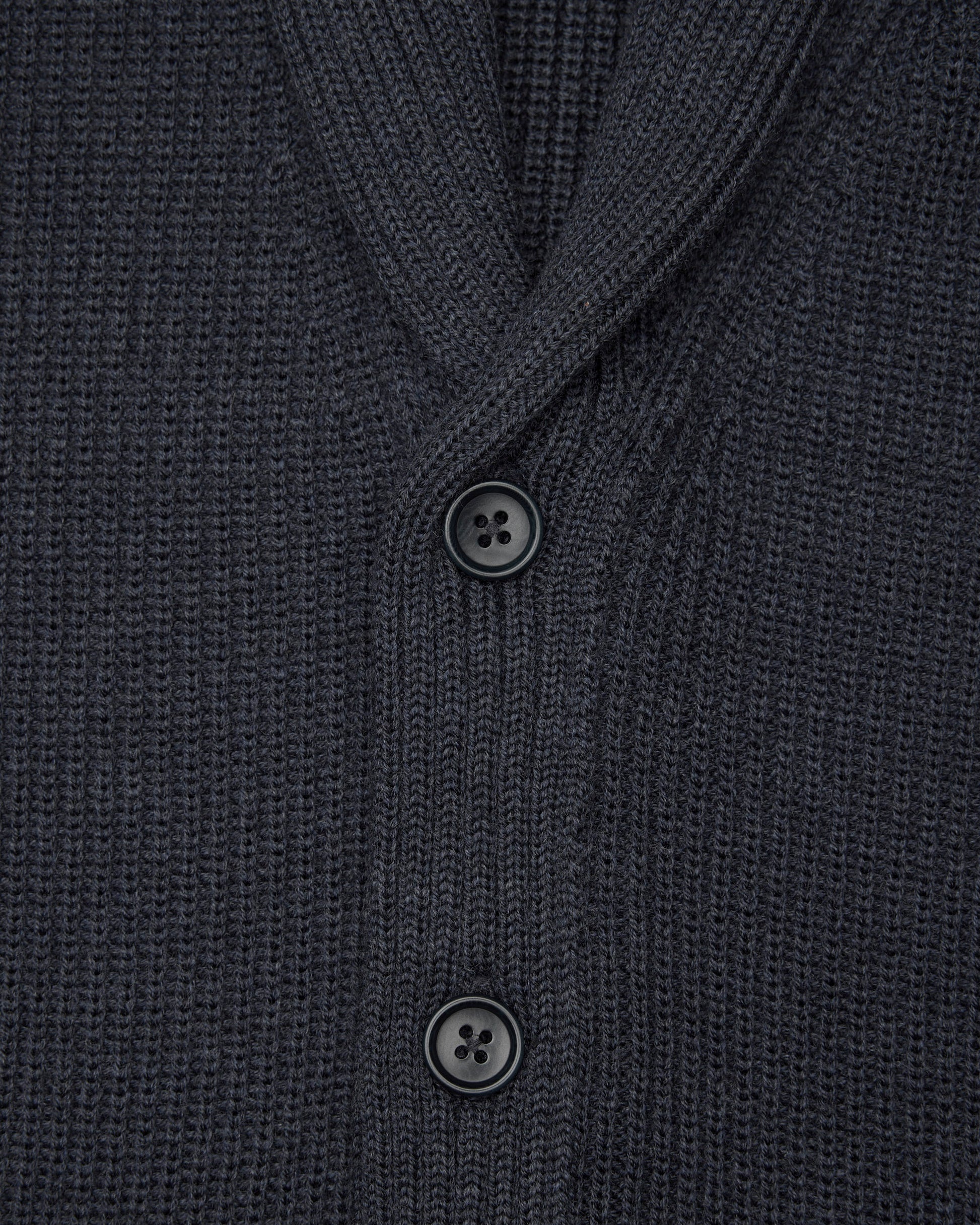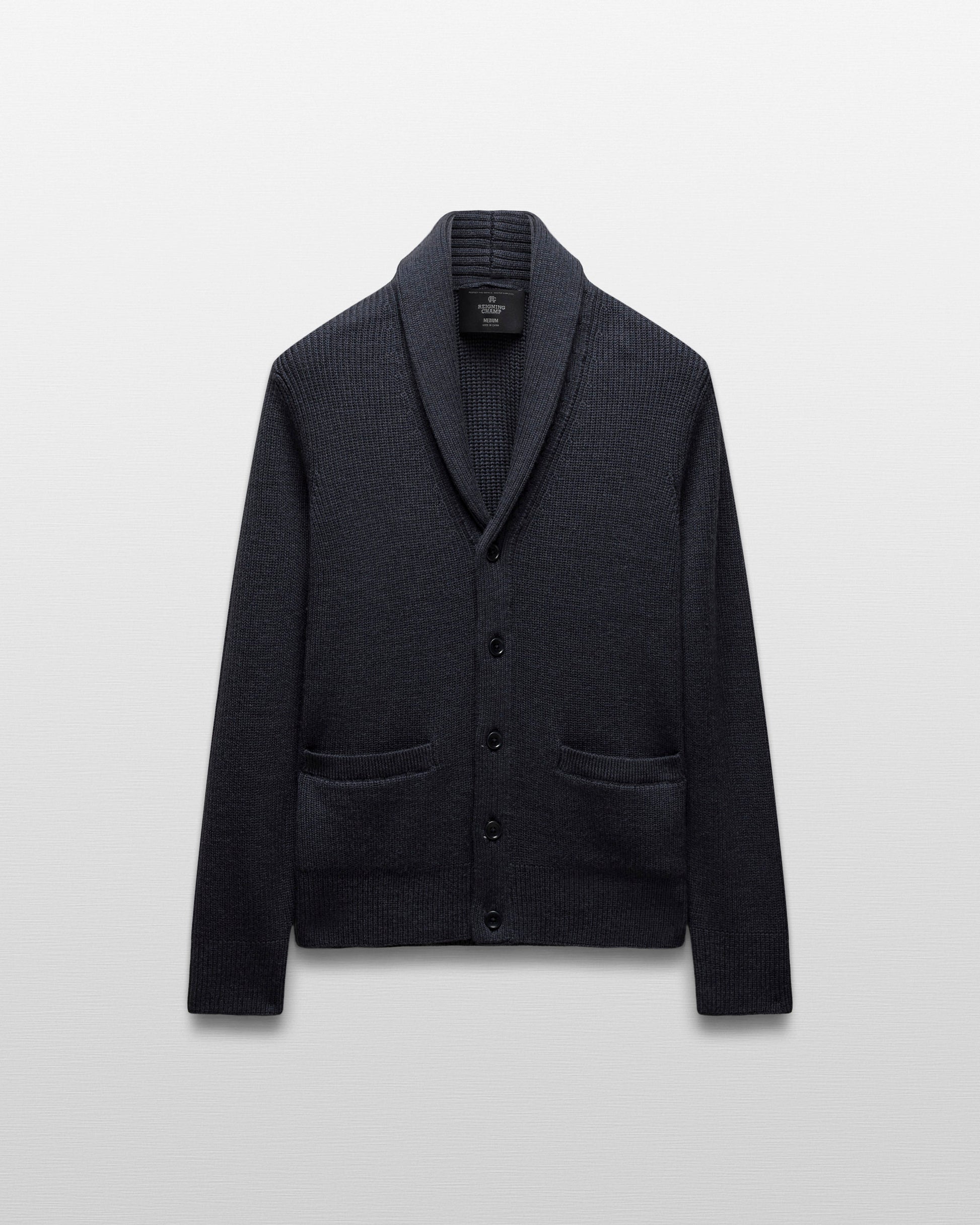 This shawl cardigan is crafted from premium merino wool milled in Italy. Featuring a standard fit, with fully fashioned seam construction. Designed with a rib knit collar and placket, faux horn buttons, semi-raglan sleeves, inset welt pockets, and rib cuffs and hem.