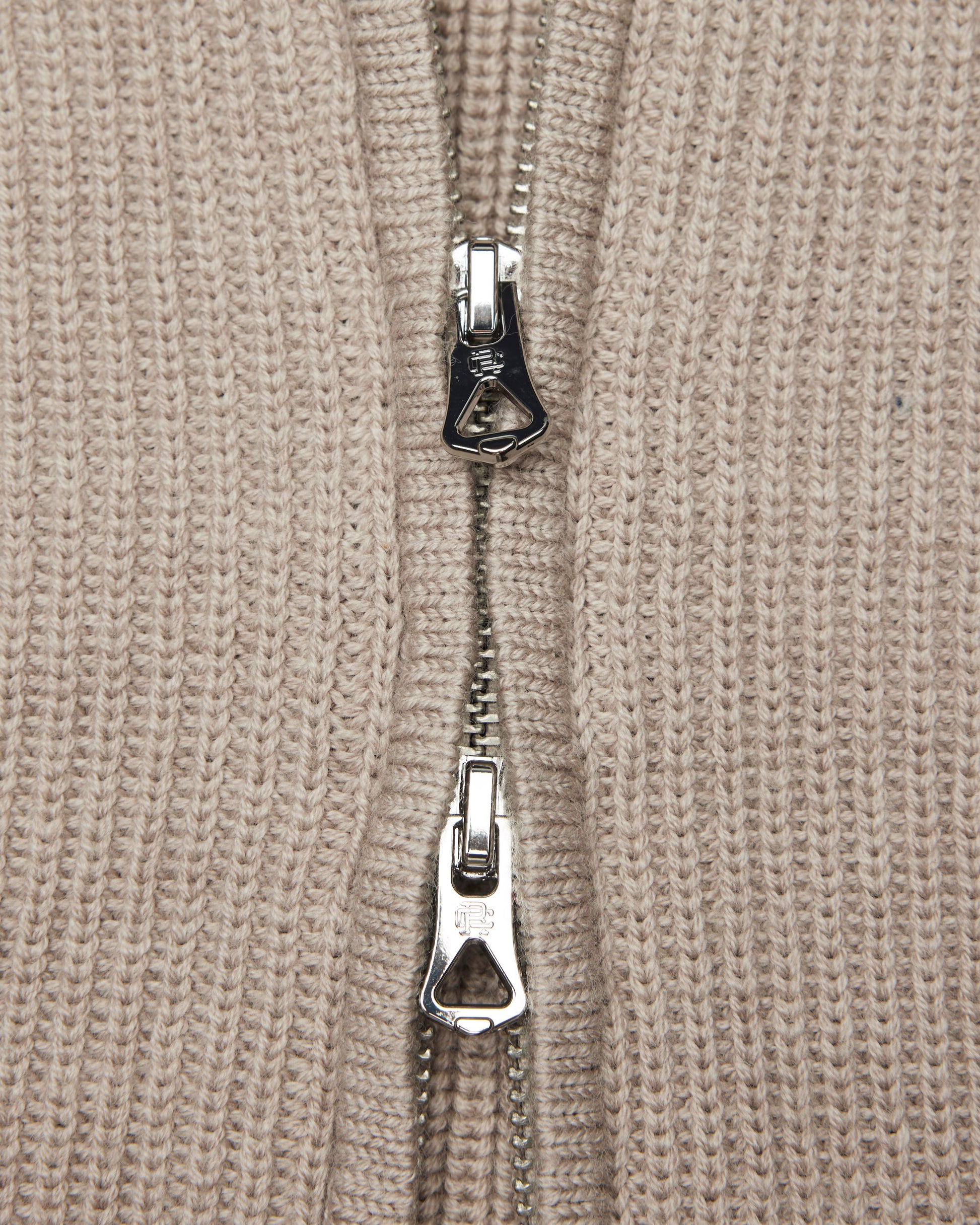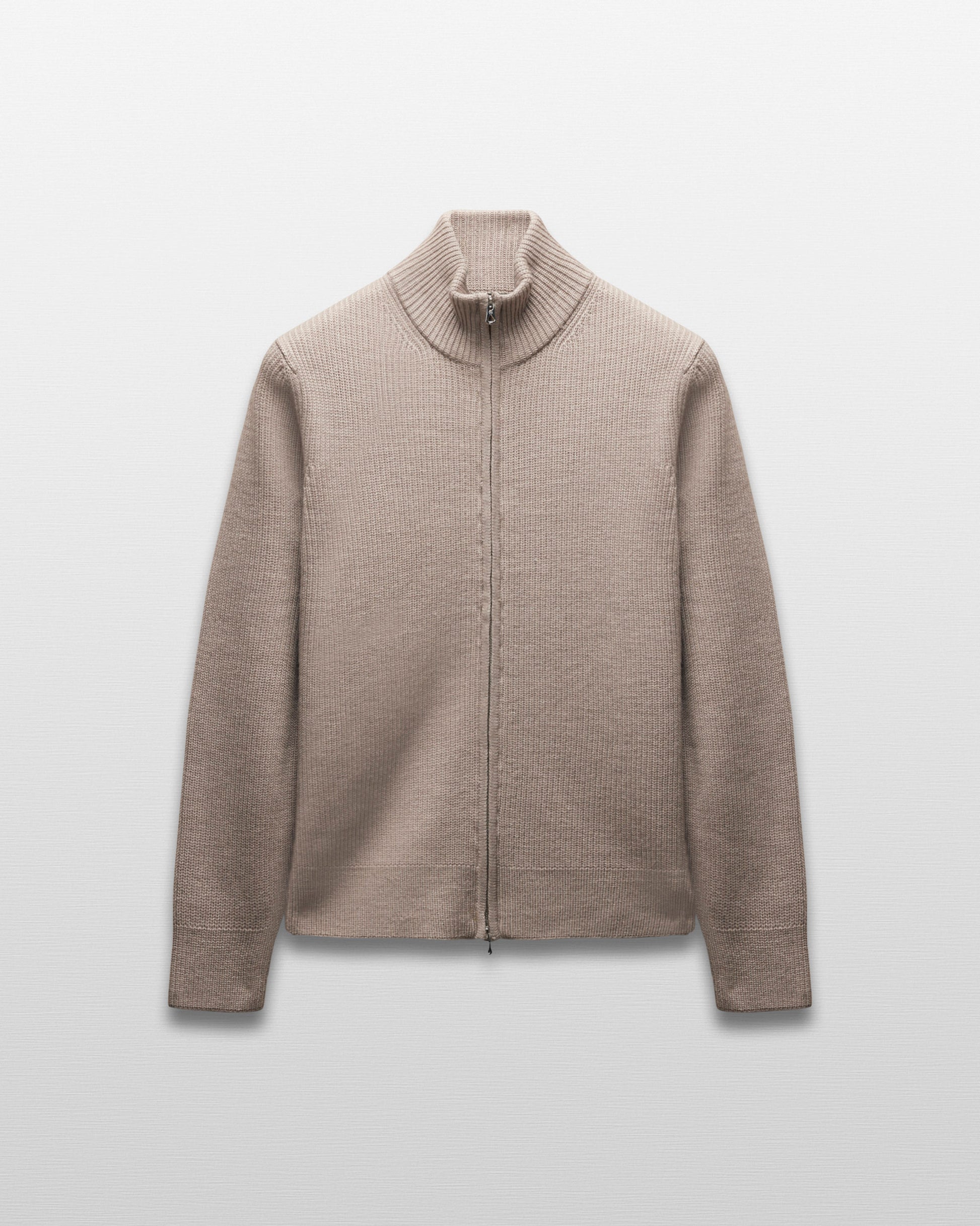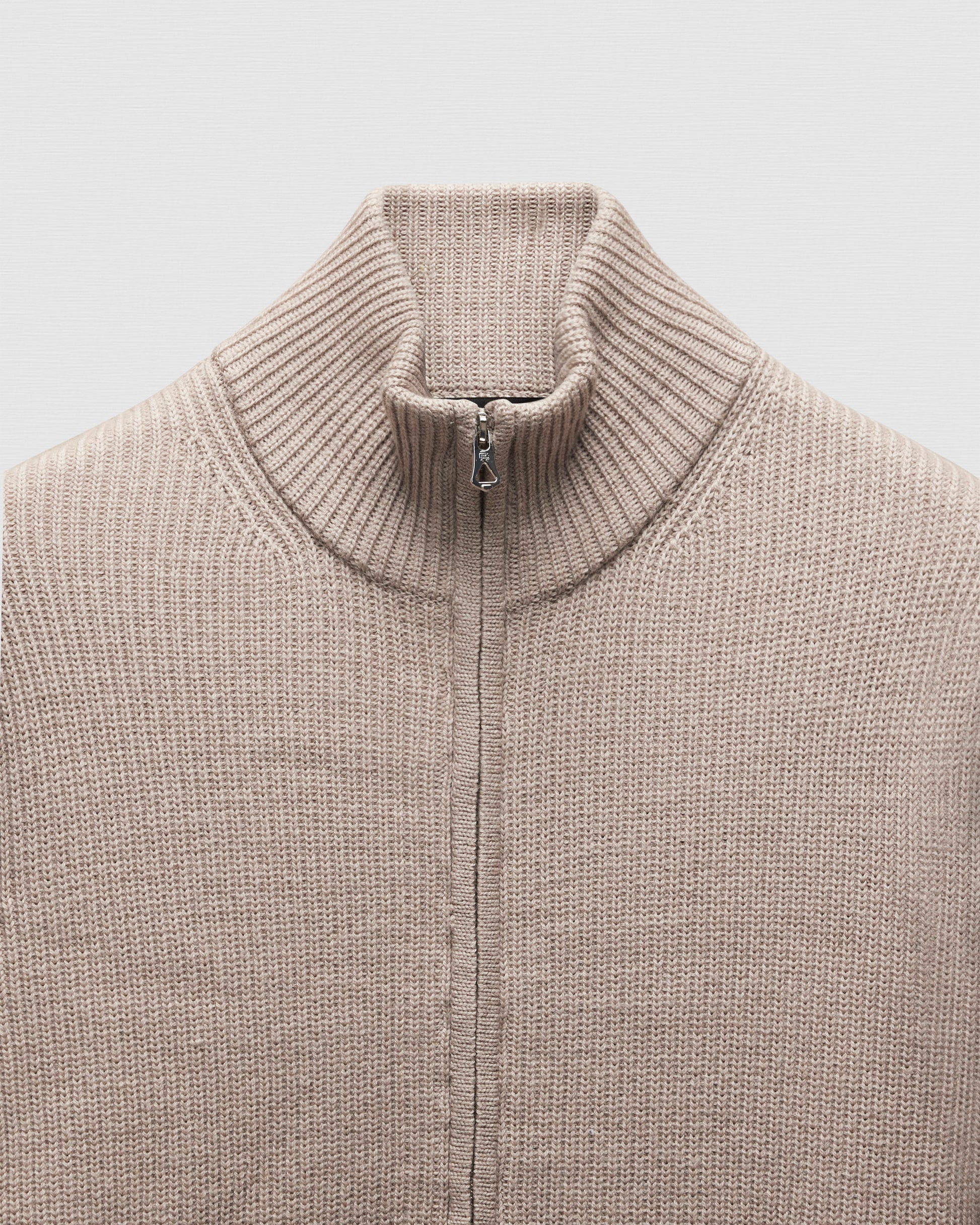 This mock neck zip up is crafted from premium merino wool milled in Italy. Featuring a standard fit, with fully fashioned seam construction. Designed with a convertible collar, a two-way YKK metal zip closure, and rib cuffs and hem.