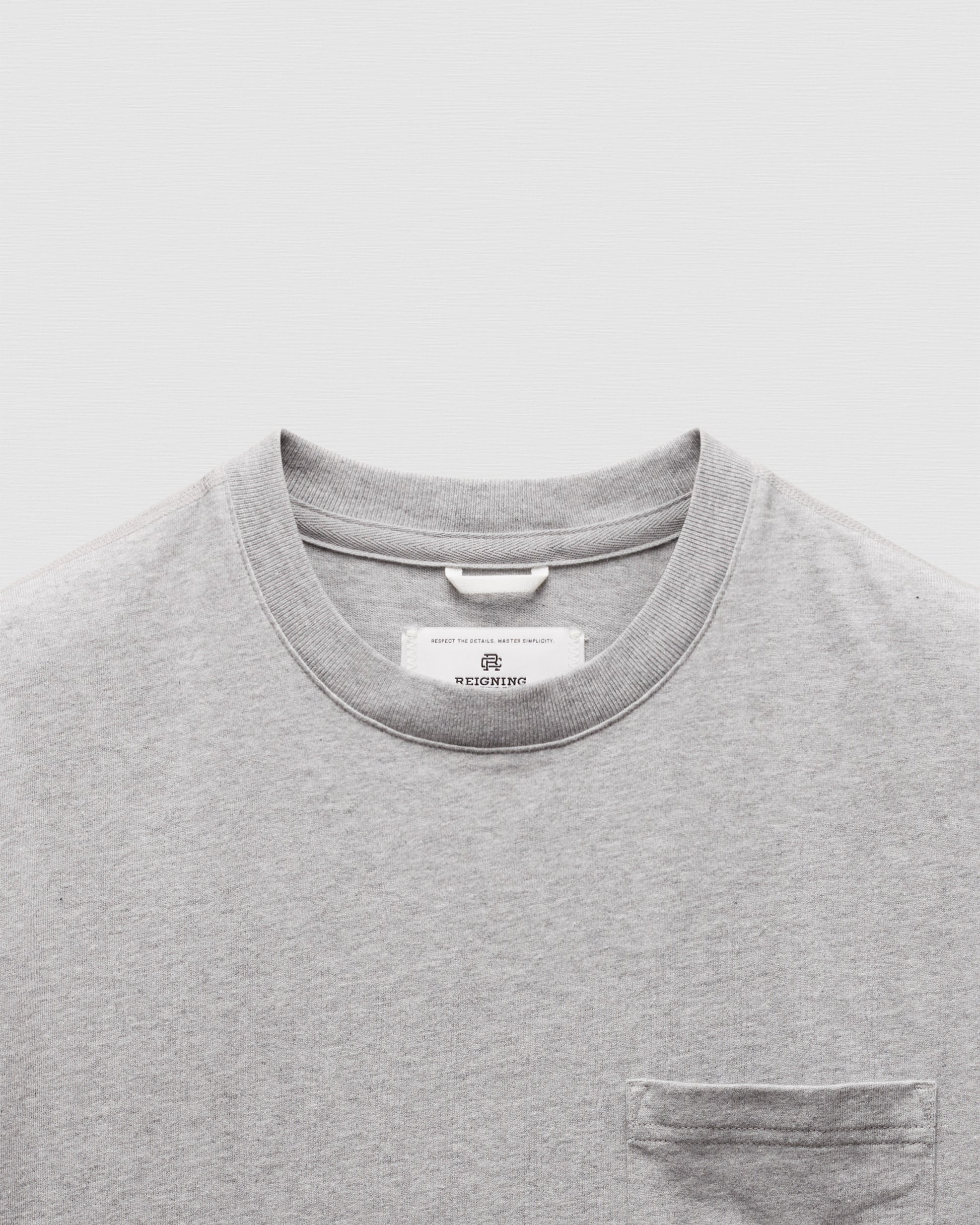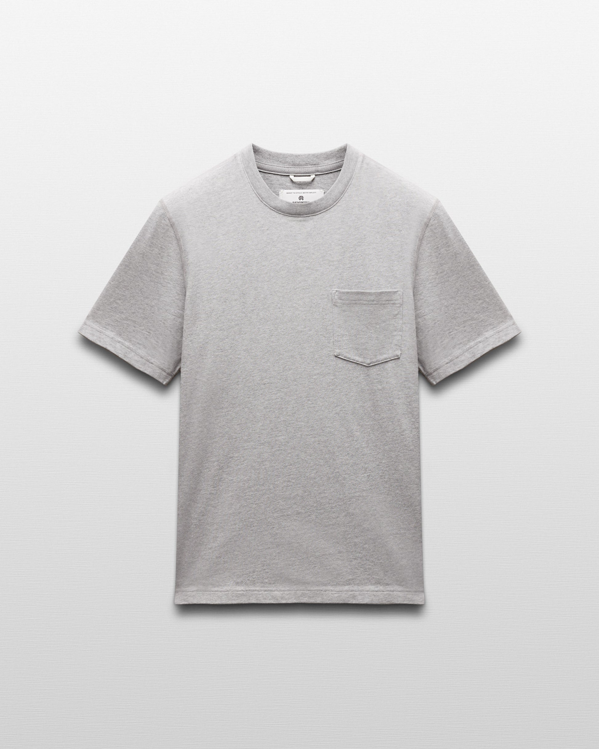 Our midweight short sleeve pocket T-shirt is made from premium cotton, balancing substantial structure with a soft hand. Featuring a standard fit that tapers slightly from the chest to the waist hem. Designed with a wide rib collar, set-in sleeves, left chest pocket, and signature flatlock construction.