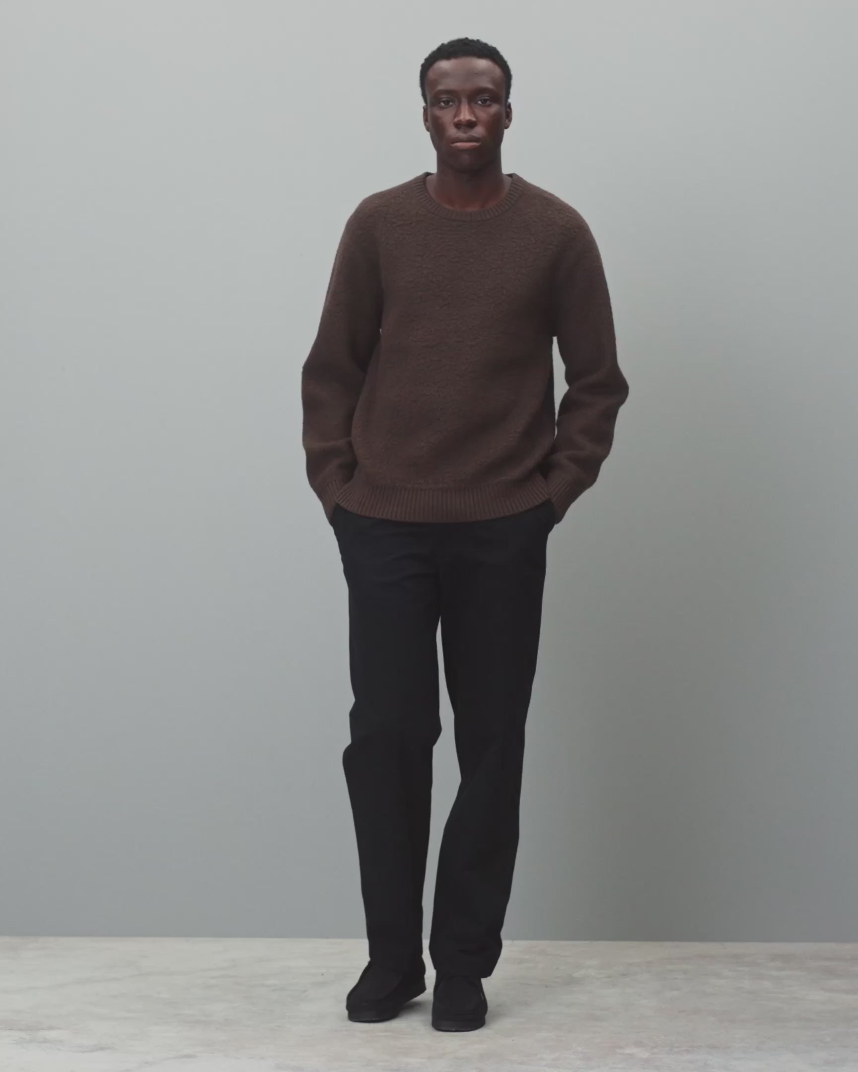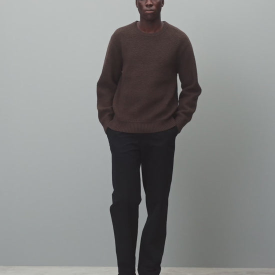 This winter-weight crewneck sweater is knit from a merino-cotton blend with a curly, boucle-textured feel. Featuring a standard fit, with full-cut sleeves and torso to provide versatility for layering. Designed with a double rib collar, side gussets, and rib knit cuffs and hem. Finished with a raised needle punch logo at side hem.