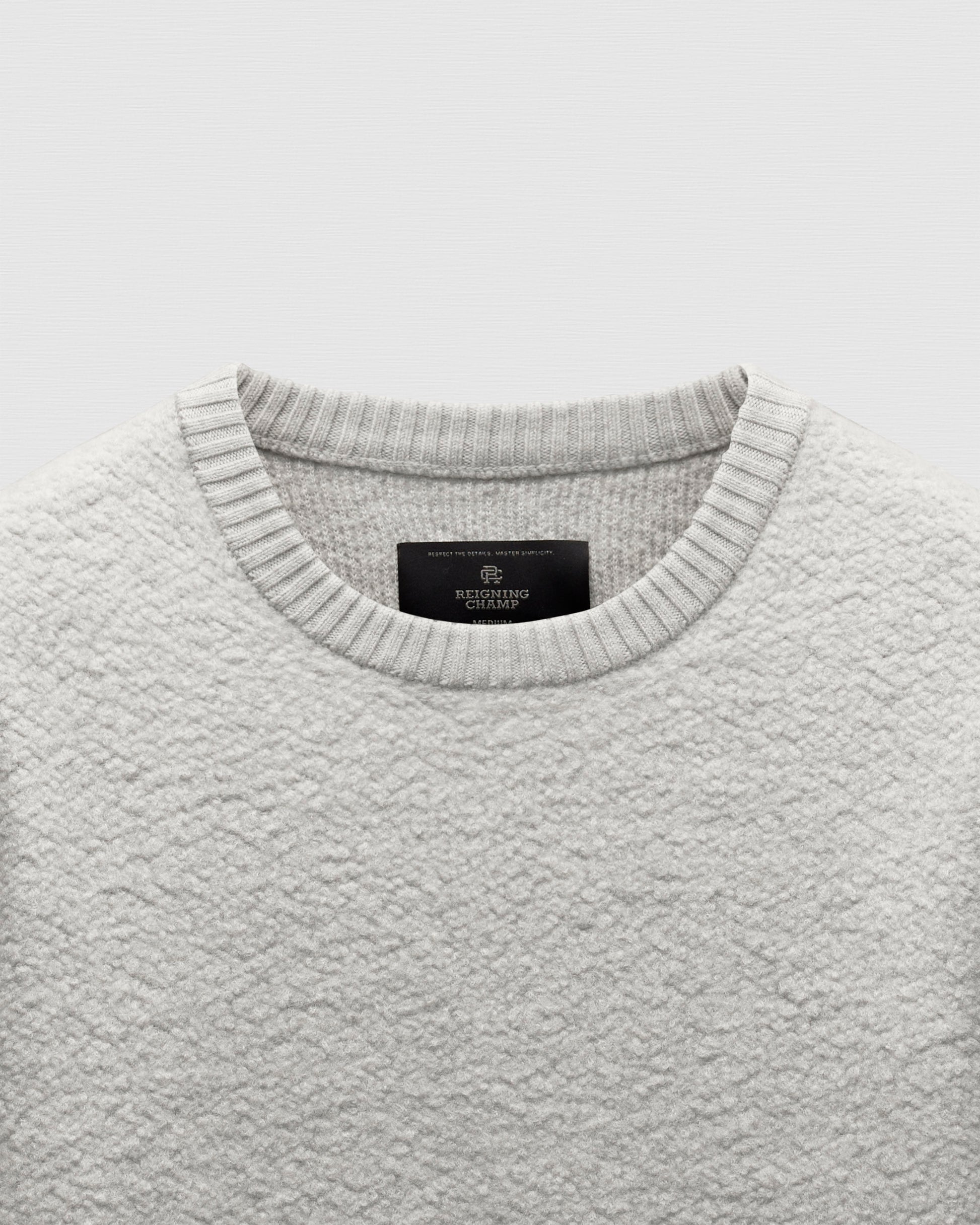 This winter-weight crewneck sweater is knit from a merino-cotton blend with a curly, boucle-textured feel. Featuring a standard fit, with full-cut sleeves and torso to provide versatility for layering. Designed with a double rib collar, side gussets, and rib knit cuffs and hem. Finished with a raised needle punch logo at side hem.