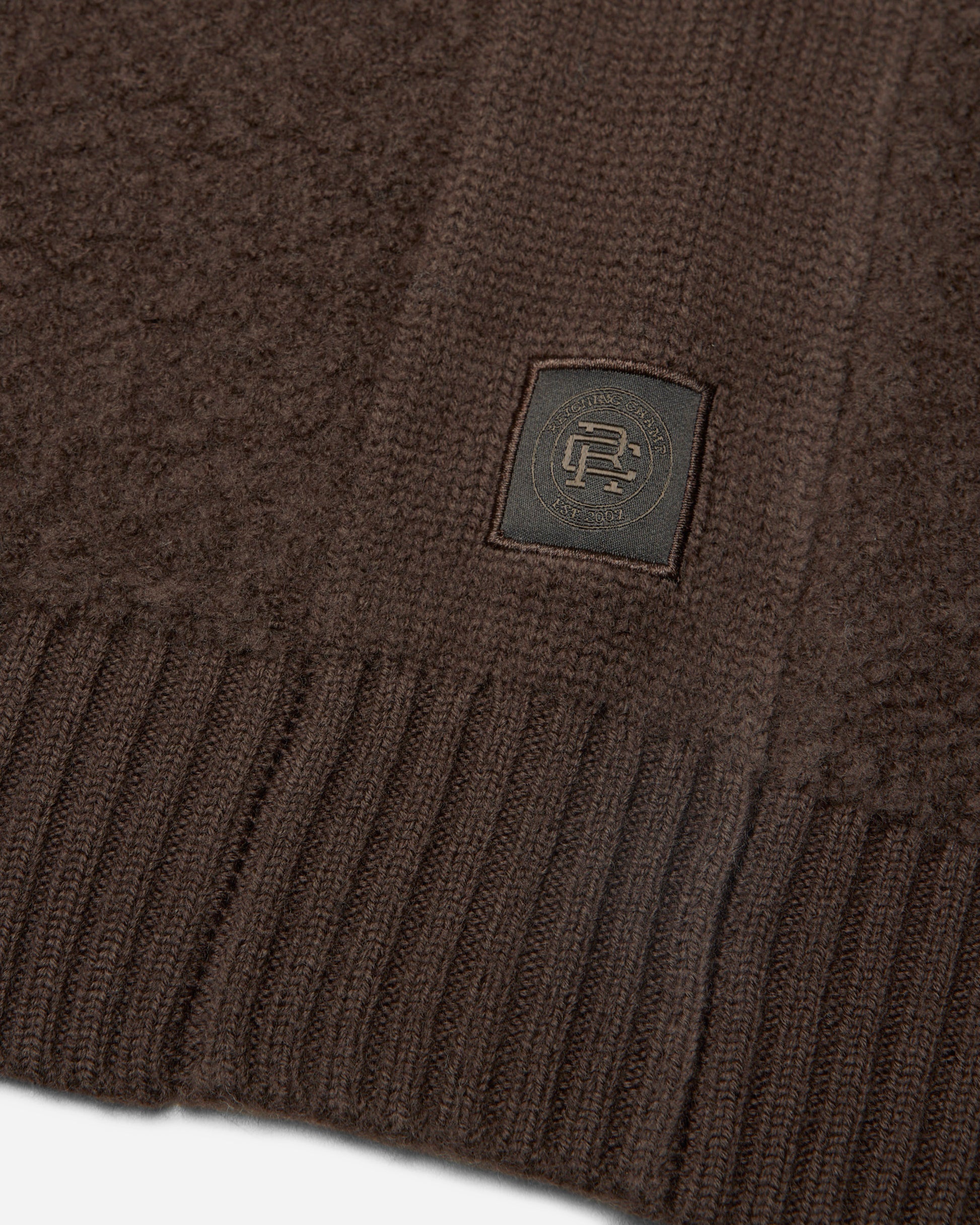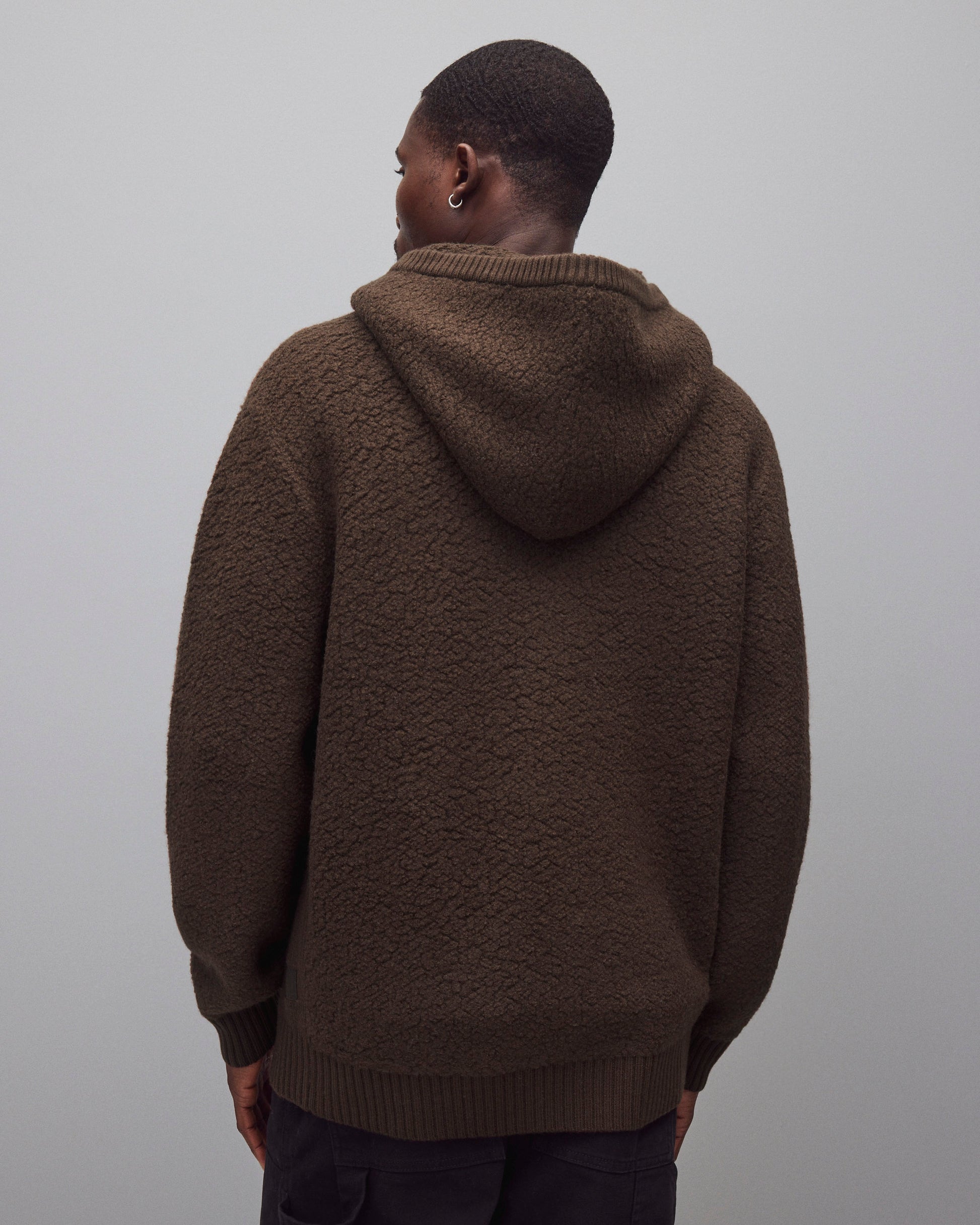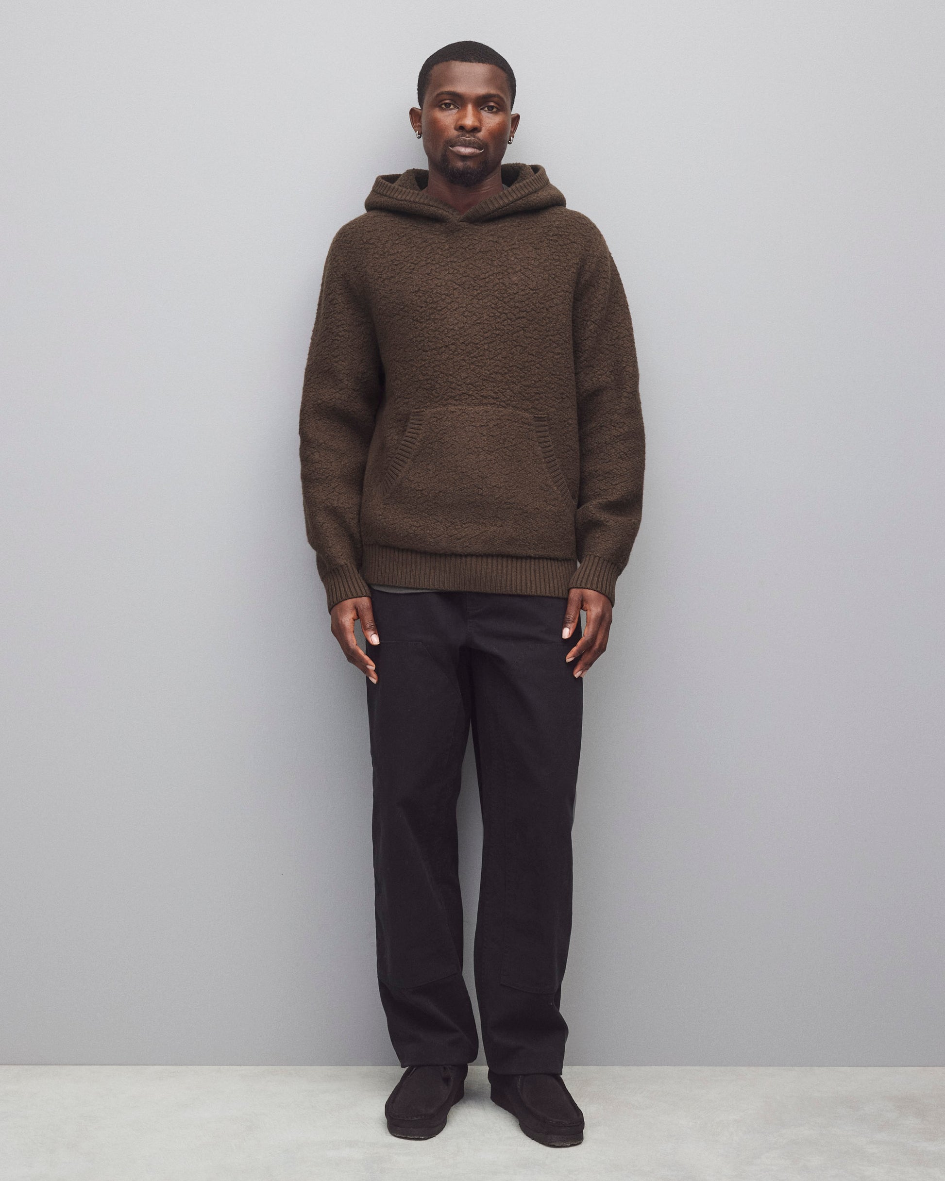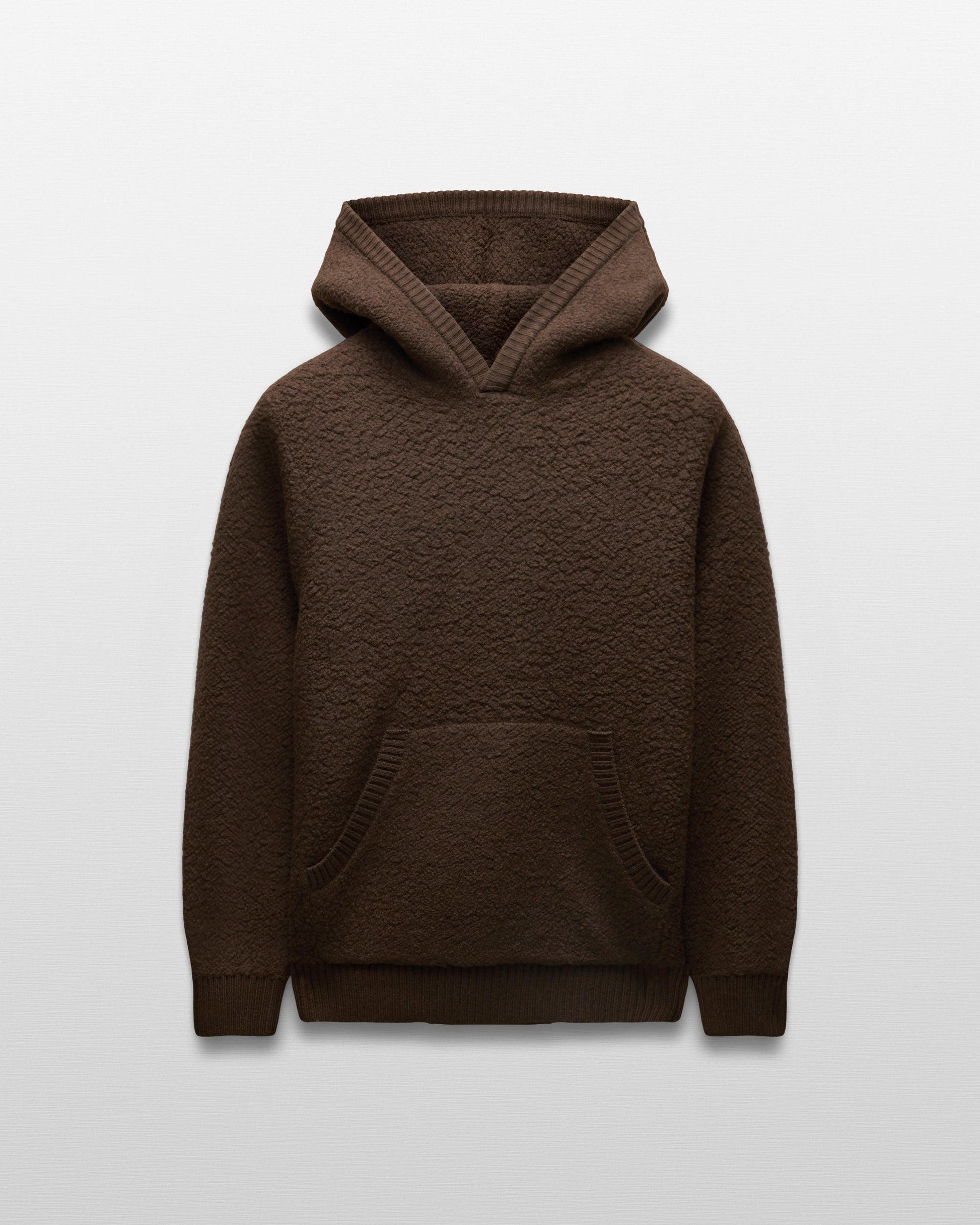 This winter-weight hoodie is knit from a merino-cotton blend with a curly, boucle-textured feel. Featuring a standard fit, with full-cut sleeves and torso to provide versatility for layering. Designed with a dual-layer crossover hood, ribbed front pocket, side gussets, and rib knit cuffs and hem. Finished with a raised needle punch logo at side hem.