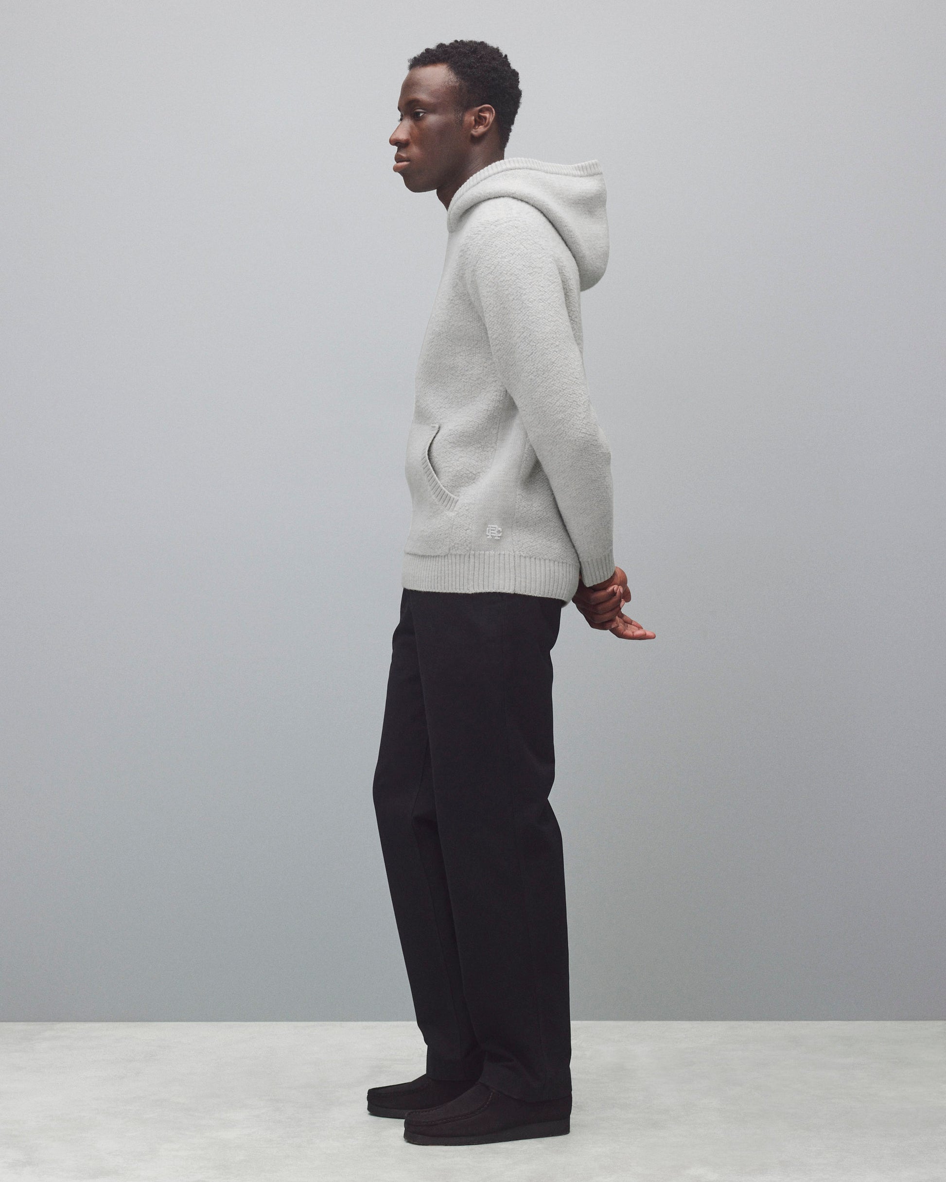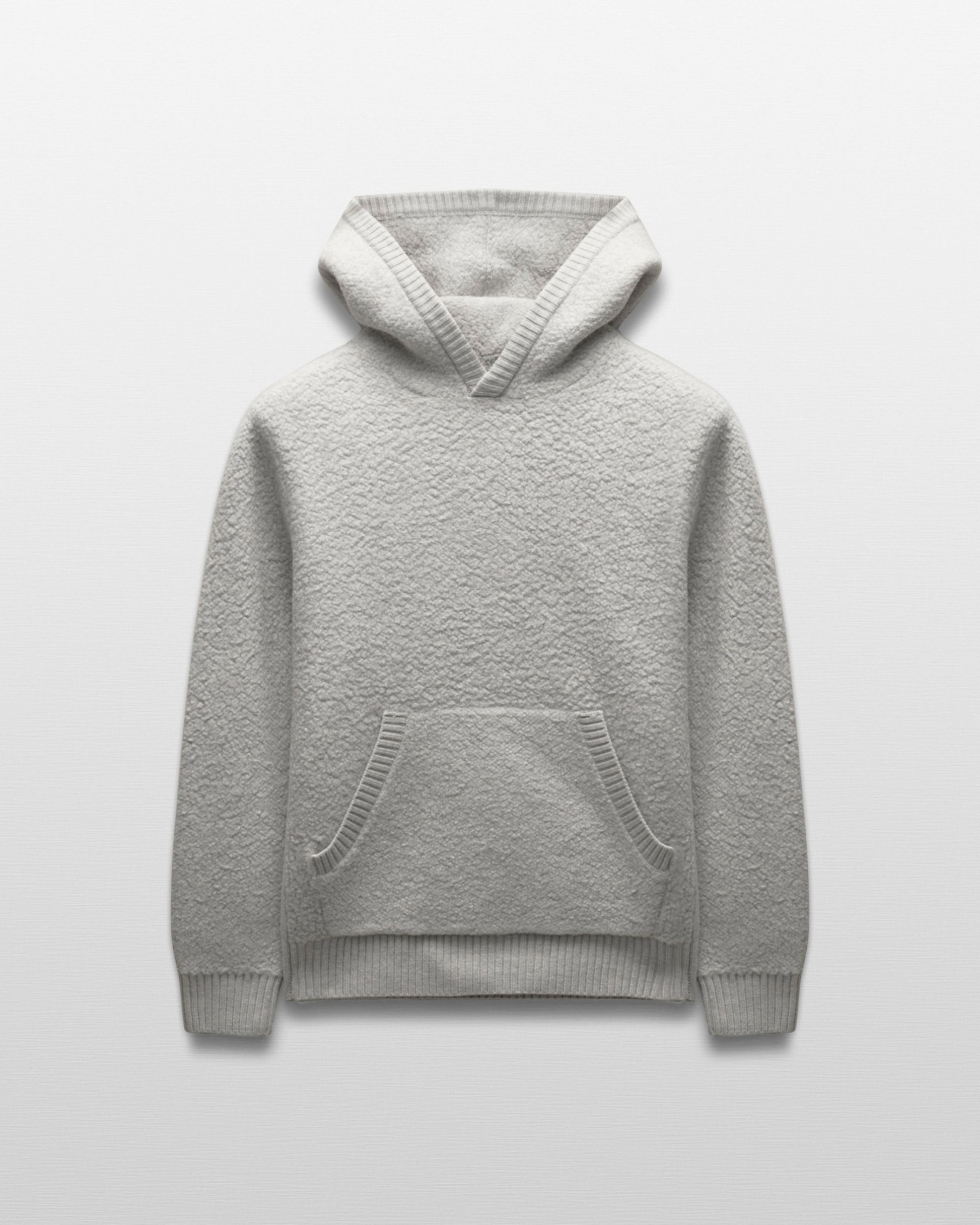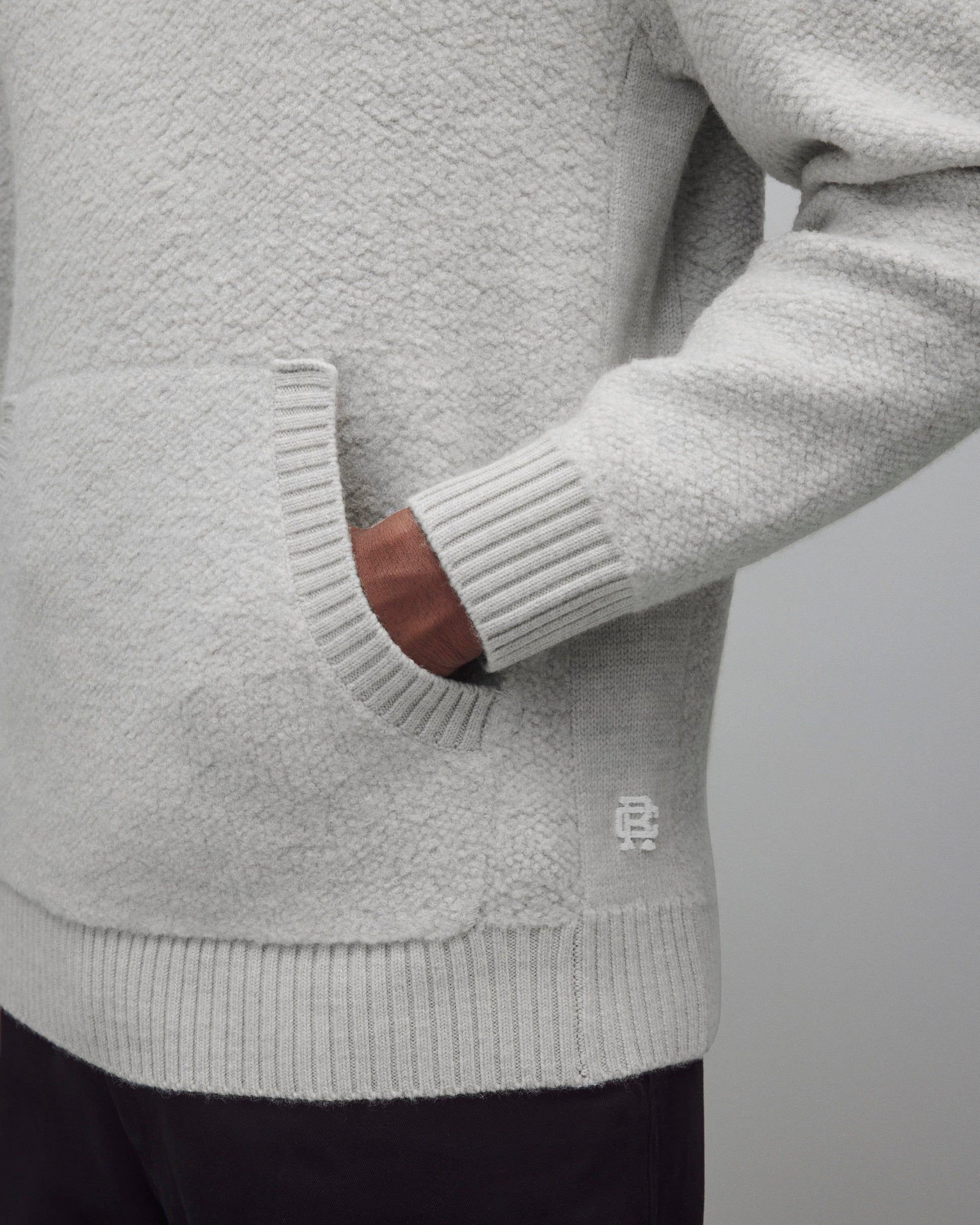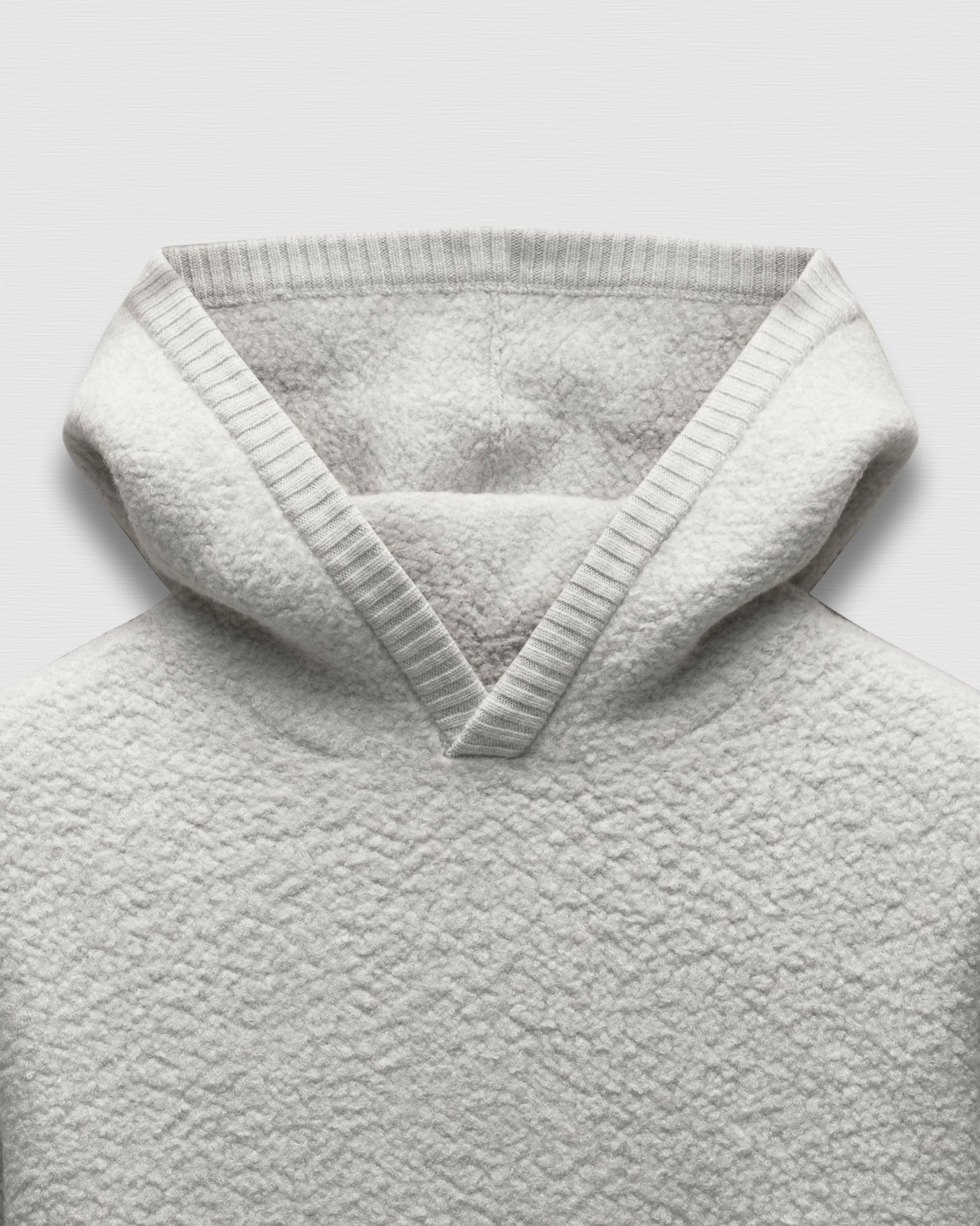 This winter-weight hoodie is knit from a merino-cotton blend with a curly, boucle-textured feel. Featuring a standard fit, with full-cut sleeves and torso to provide versatility for layering. Designed with a dual-layer crossover hood, ribbed front pocket, side gussets, and rib knit cuffs and hem. Finished with a raised needle punch logo at side hem.