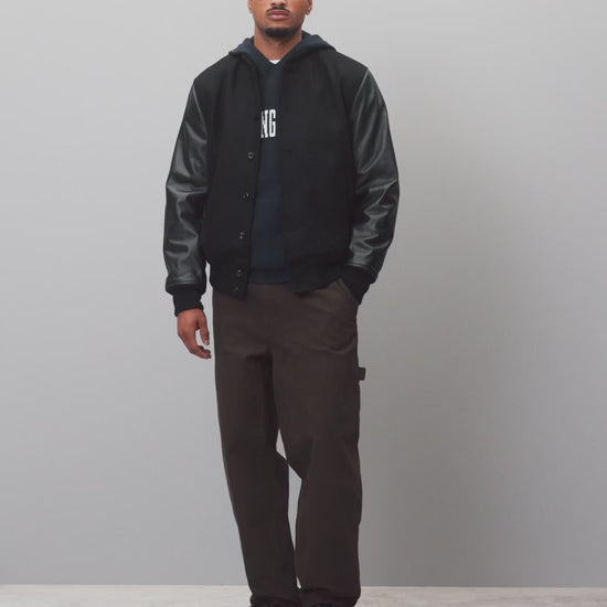 This varsity jacket is built with a combination of Italian wool cashmere and genuine leather. Featuring a generous standard fit for versatile layering, with viscose-lined sleeves and body. Designed with corozo button front closure, double welt slant pockets, an interior chest pocket, and premium rib collar, cuffs and hem.