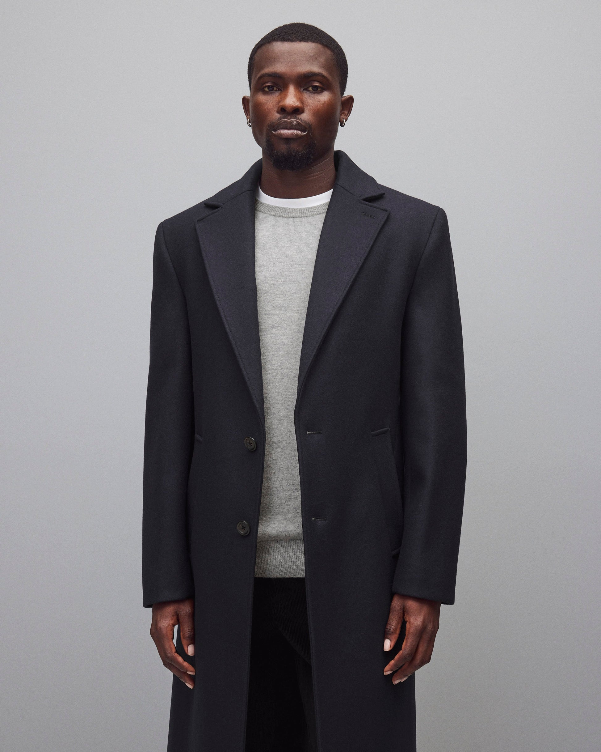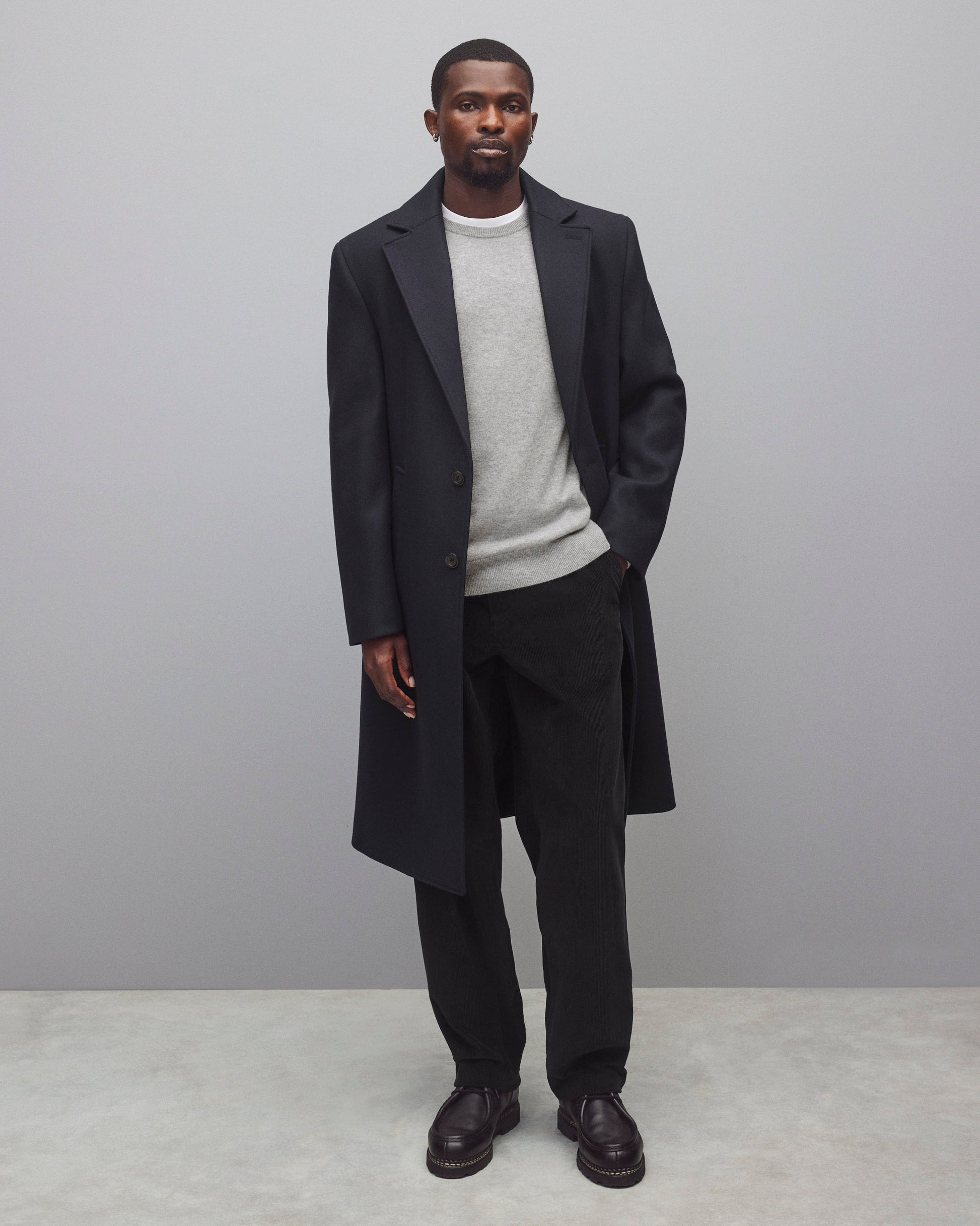 This single-breasted overcoat is crafted from an elegant Italian-milled melton wool blended with a soft cashmere touch. Featuring a generous standard fit for versatile layering, with cupro-lined sleeves and body, and a hem that falls right at the knee. Designed with notch lapels, faux horn button closure, slanted welt pockets, an interior chest pocket, and a single rear vent.