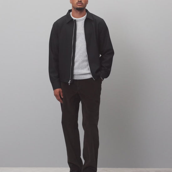 This collared zip jacket is crafted from an Italian wool twill with structured drape and a refined workwear feel. Featuring a standard fit with full-cut sleeves and torso, and a cupro-lined interior. Designed with a YKK Excella two-way metal zipper, corded welt pockets, adjustable button cuffs, and a flat hem.